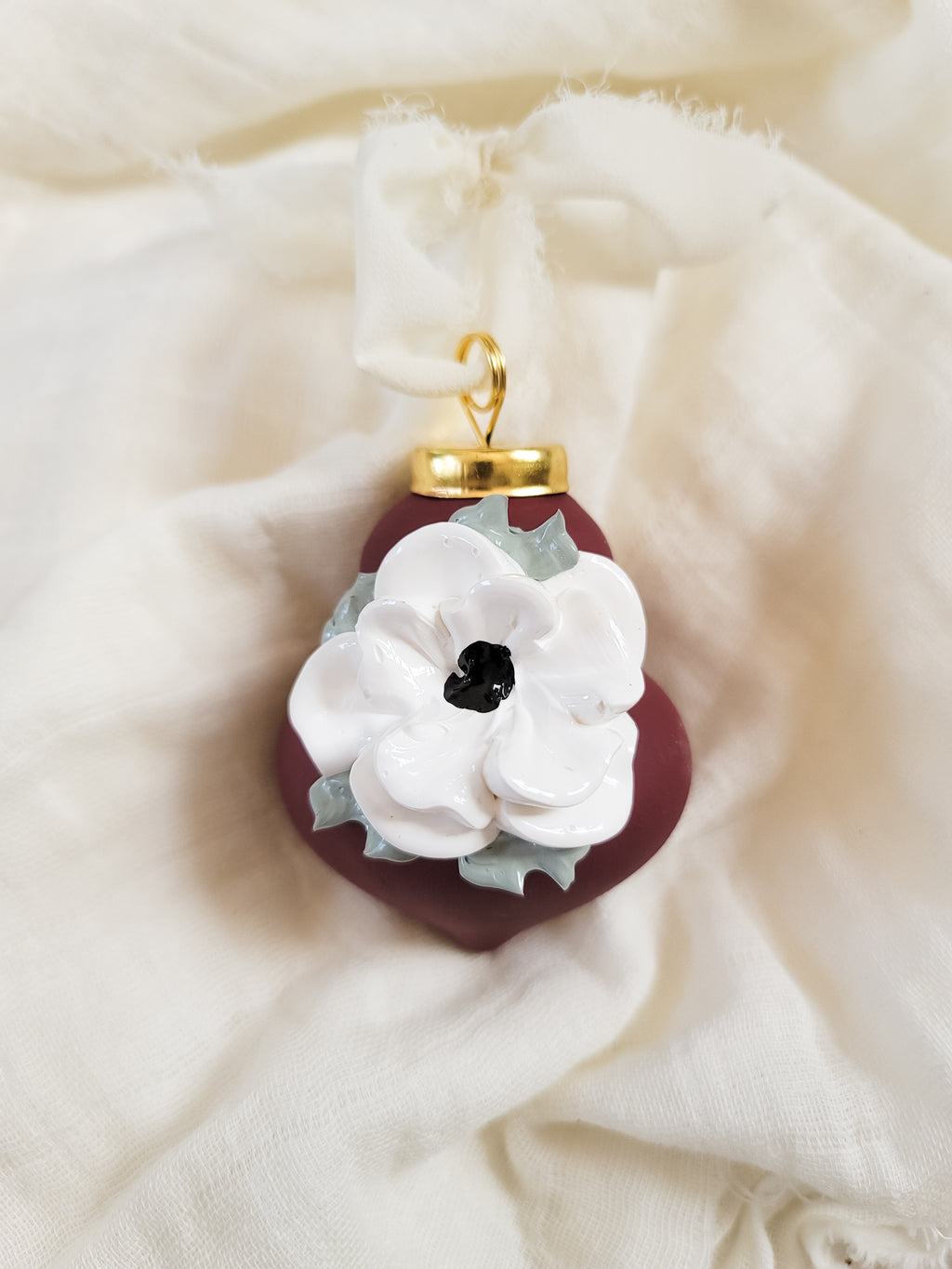 Ceramic ornament in burgundy with a white anemone flower. Each ornament comes in a cotton bag with a Wildflowers & Pistols tag and a wildflower seed paper heart that can be planted to grow your very own wildflowers. Perfect for gifting!