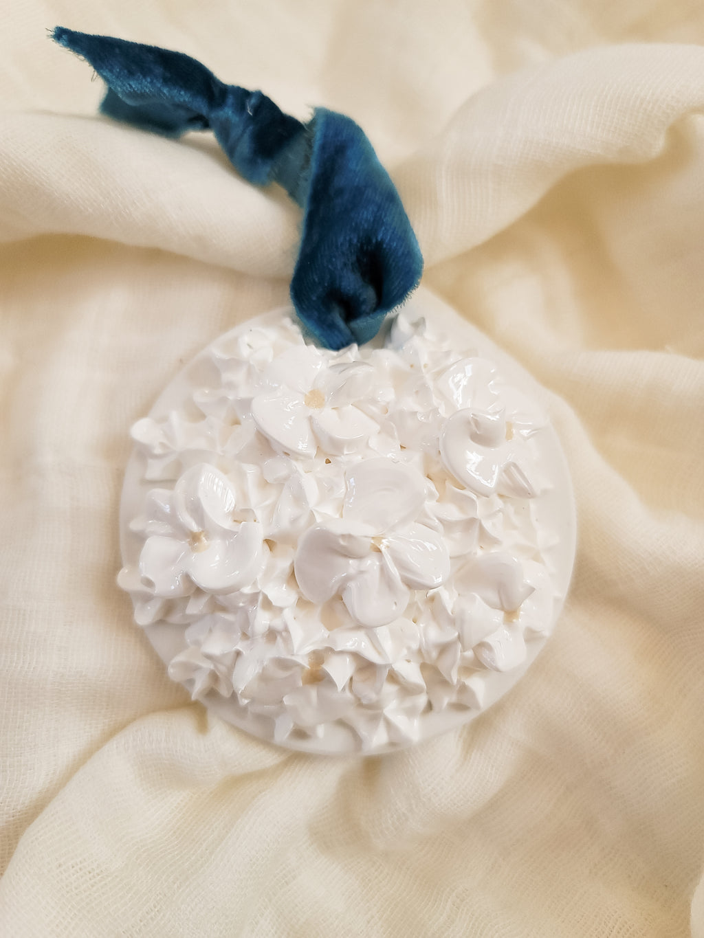 A ceramic ornament with textured white hydrangeas.Each ornament comes in a cotton bag with a Wildflowers & Pistols tag and a wildflower seed paper heart that can be planted to grow your very own wildflowers. Perfect for gifting! Assortment of different ribbons used. Measures 3"