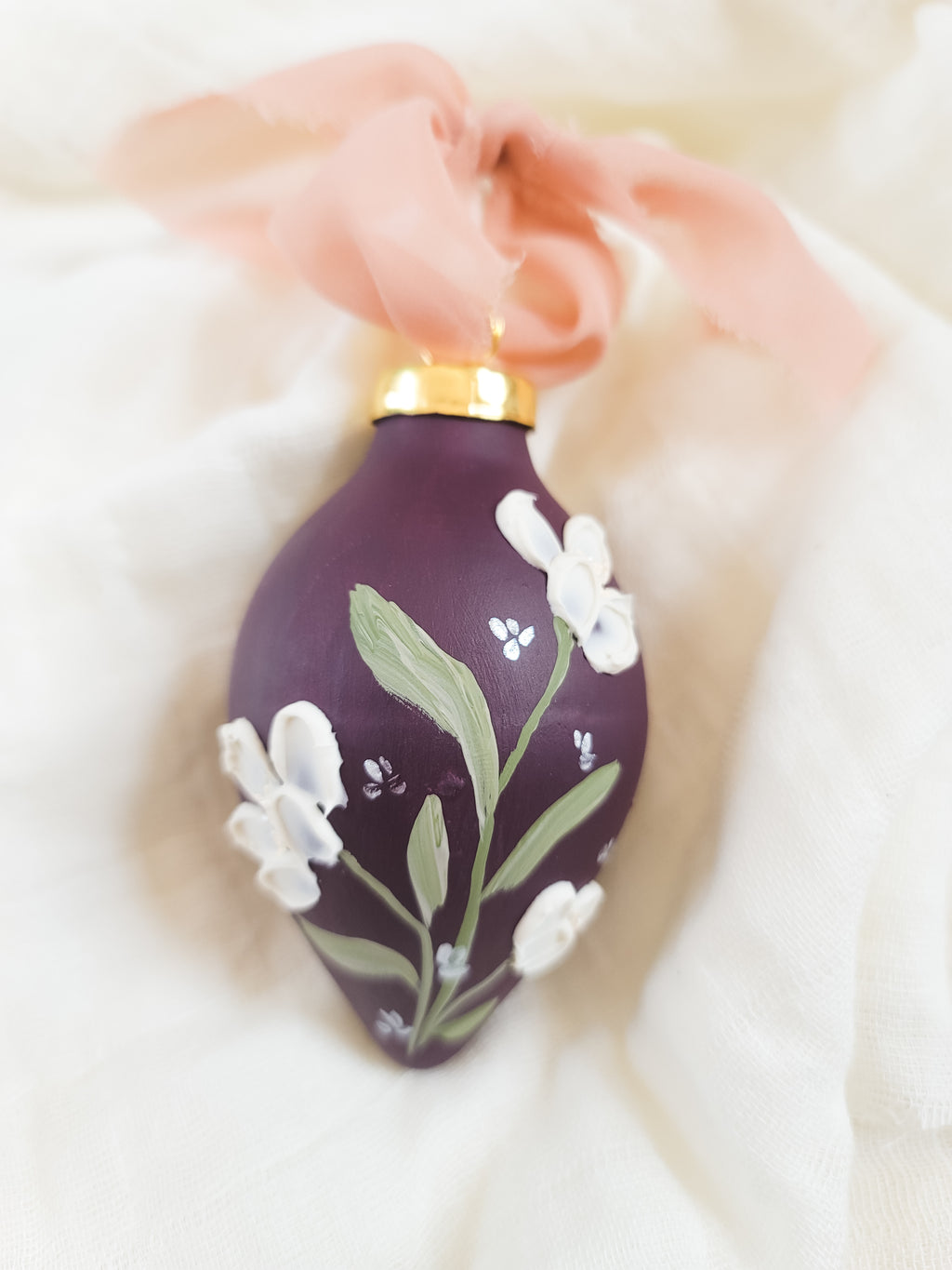A sweet ceramic ornament painted a deep plum with white flowers.