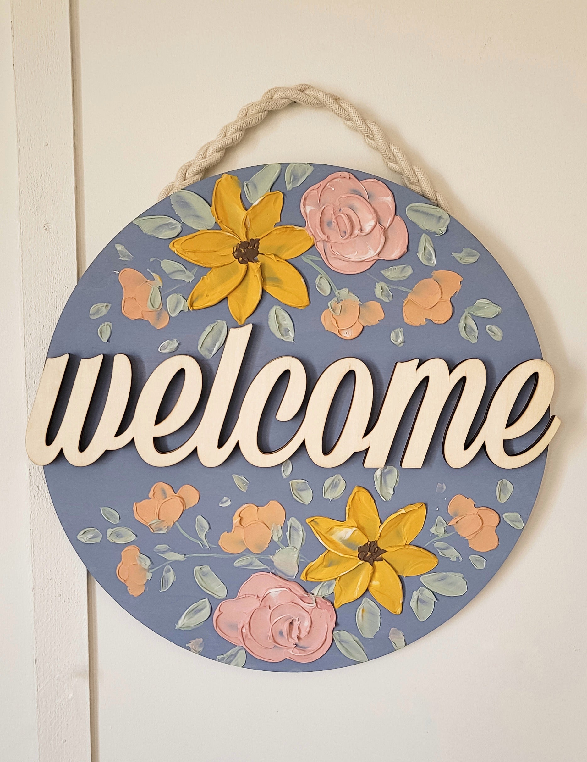 Welcome door hanger made of wood with textured, painted florals.