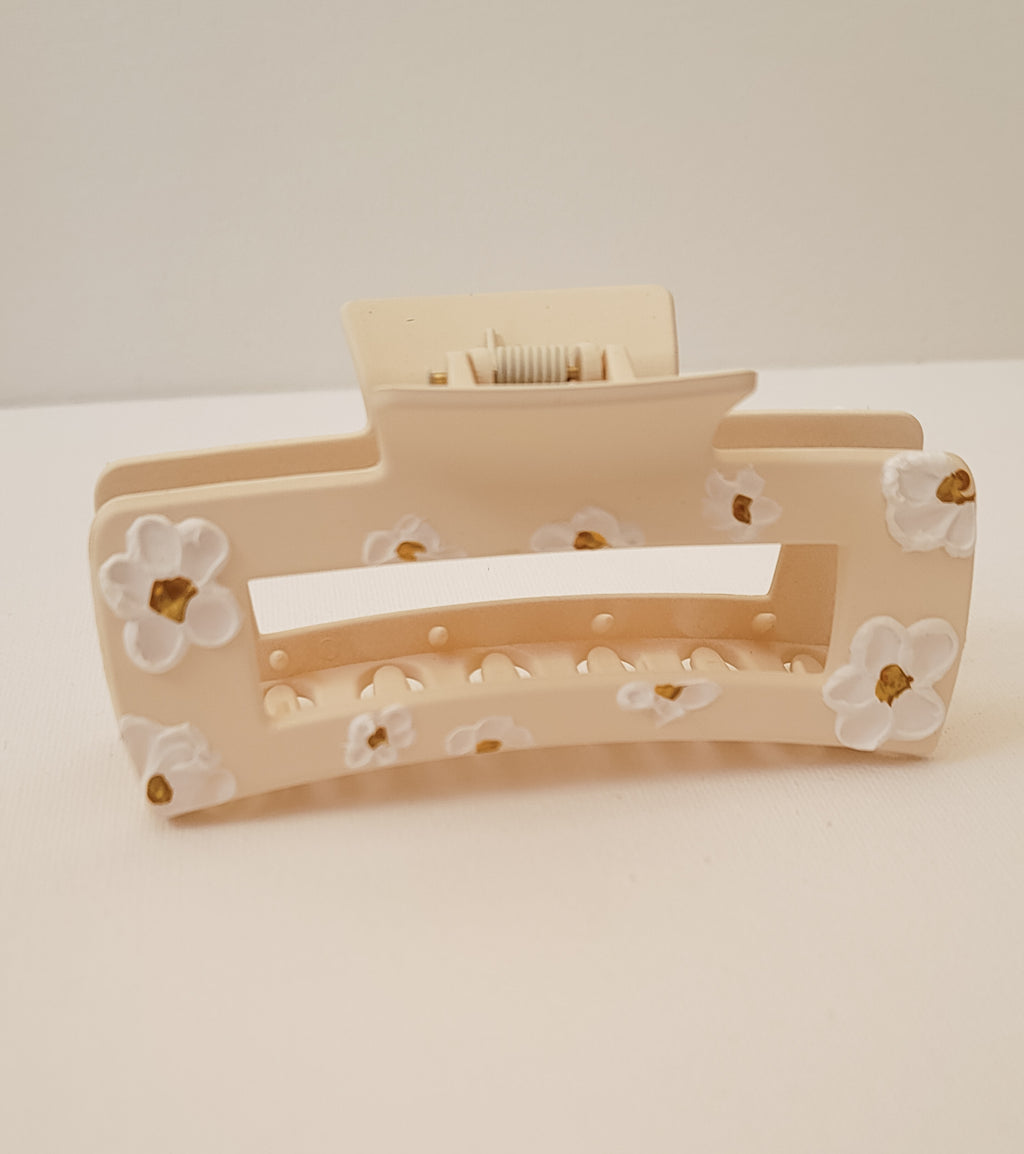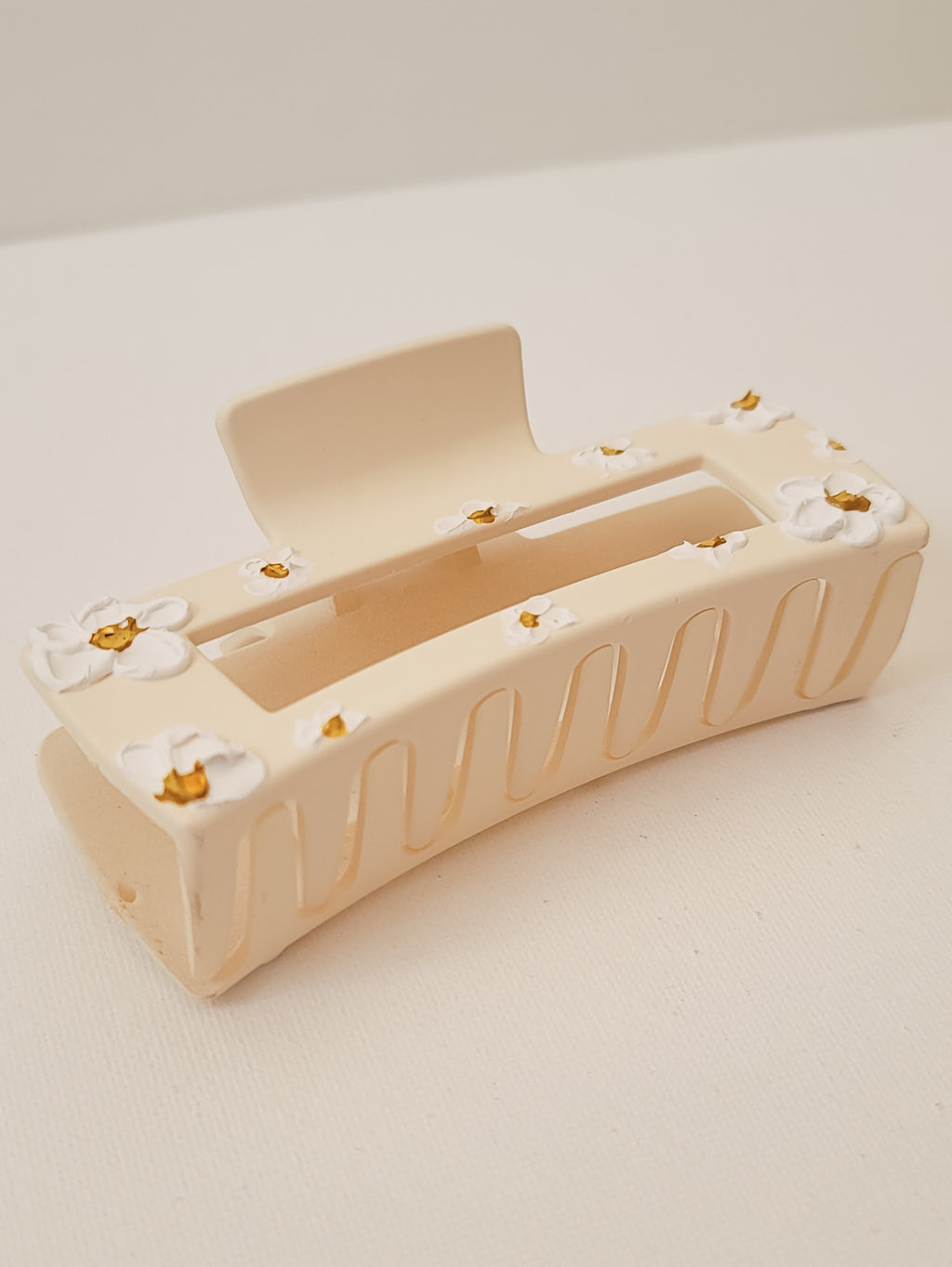 The cutest claw clip that it sure to stand out! Hand Painted with white textured flowers. The color is a soft muted yellow that leans towards a creamy white.