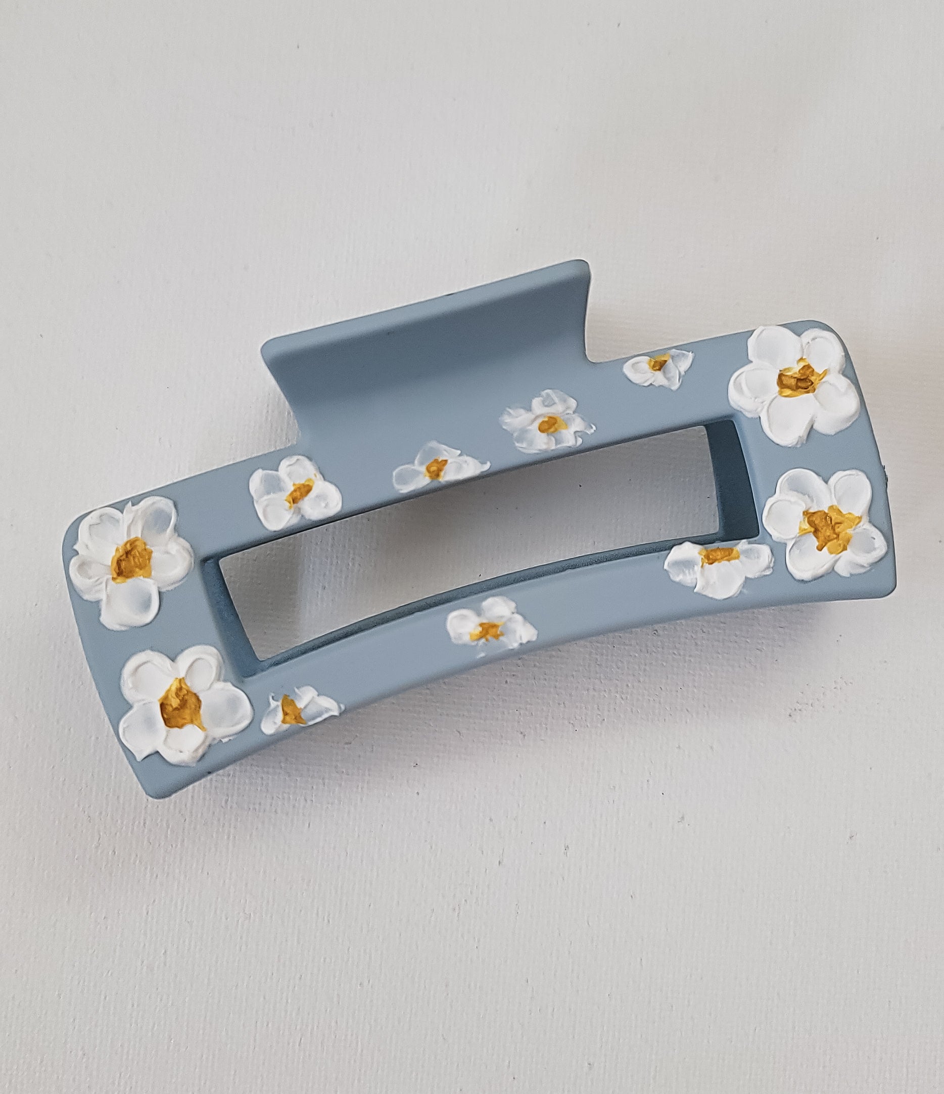 The cutest claw clip that it sure to stand out! Hand Painted with white textured flowers.