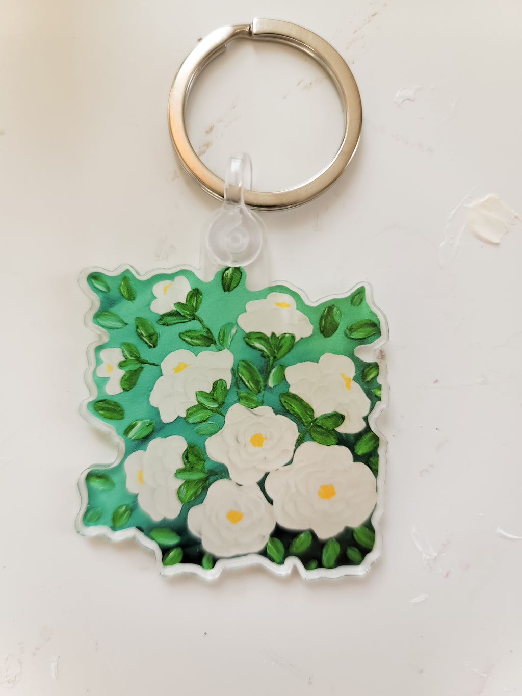 This keychain is a print of the "Viola" painting. With an emerald green background and white flowers.