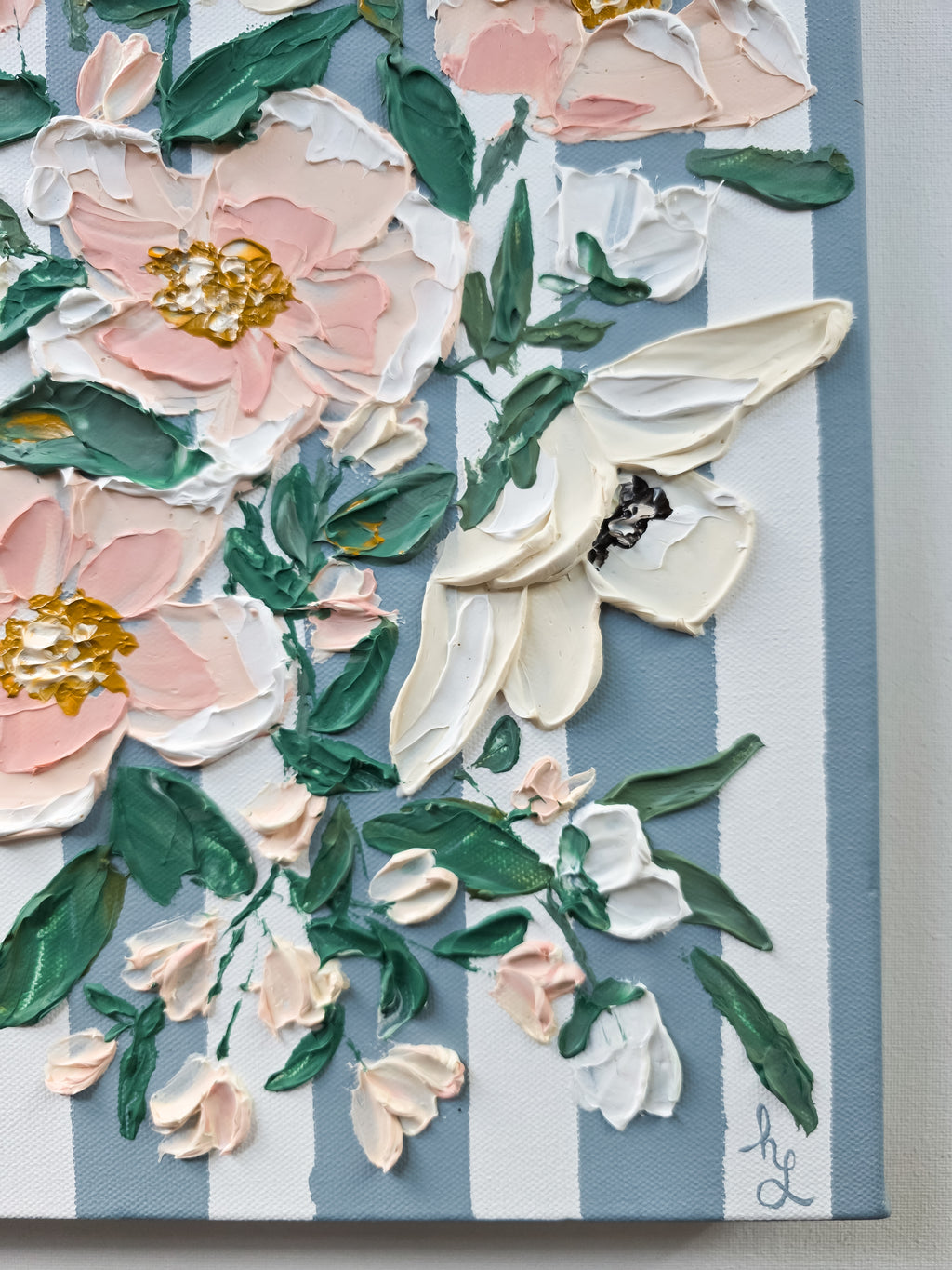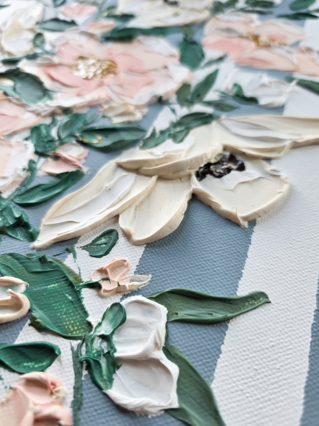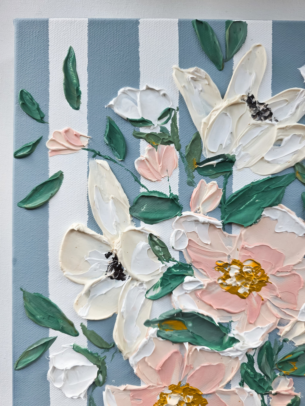This painting has such a charming, storybook feel with its soft peach and white textured florals dancing across those dreamy blue-and-white stripes.