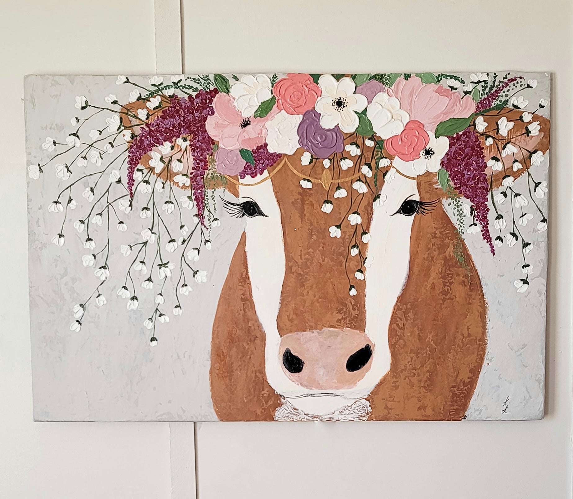 This is the very first cow painting that I ever did and is also one of the first paintings I ever did my florals on. A very special piece of artwork!