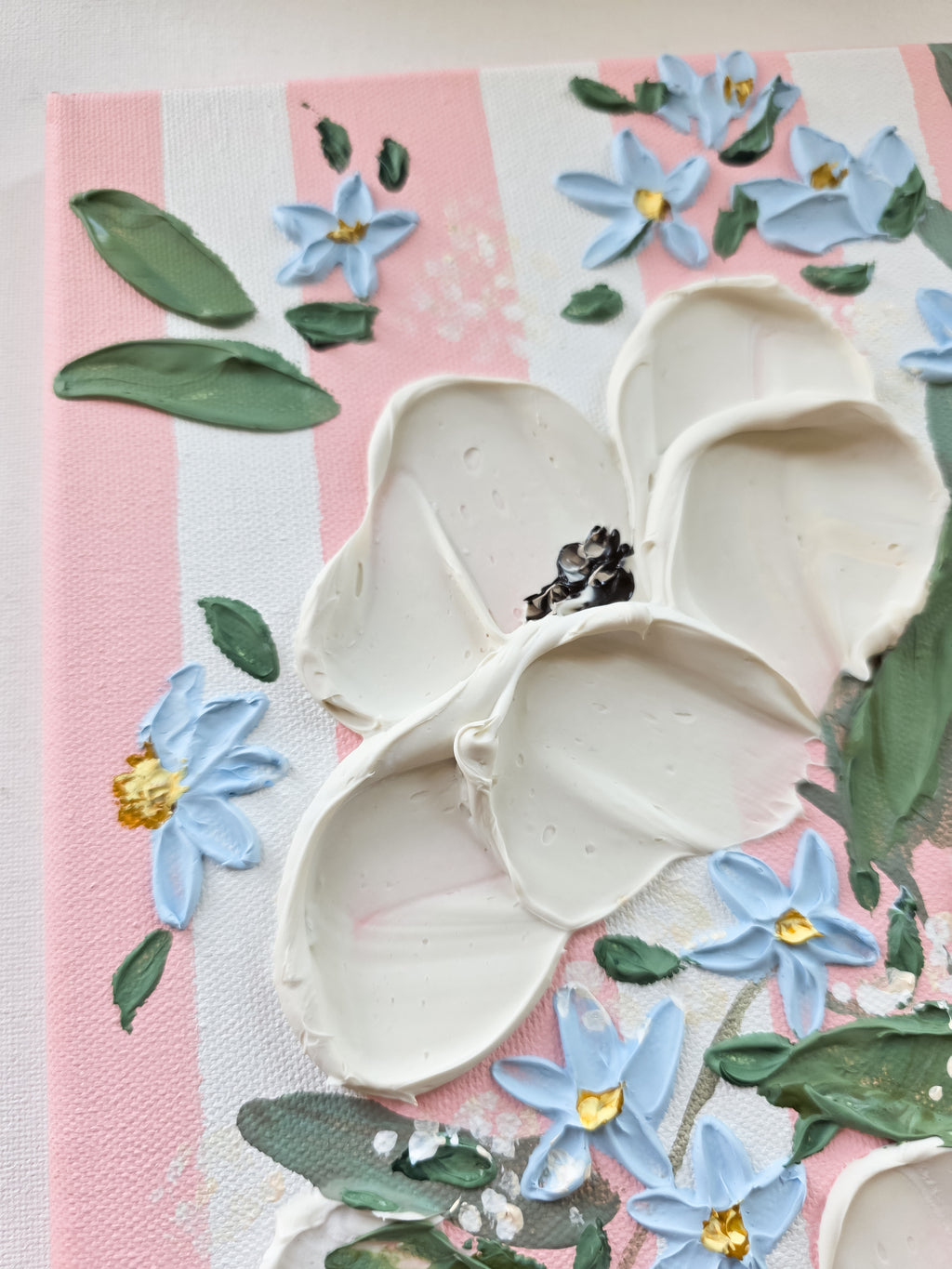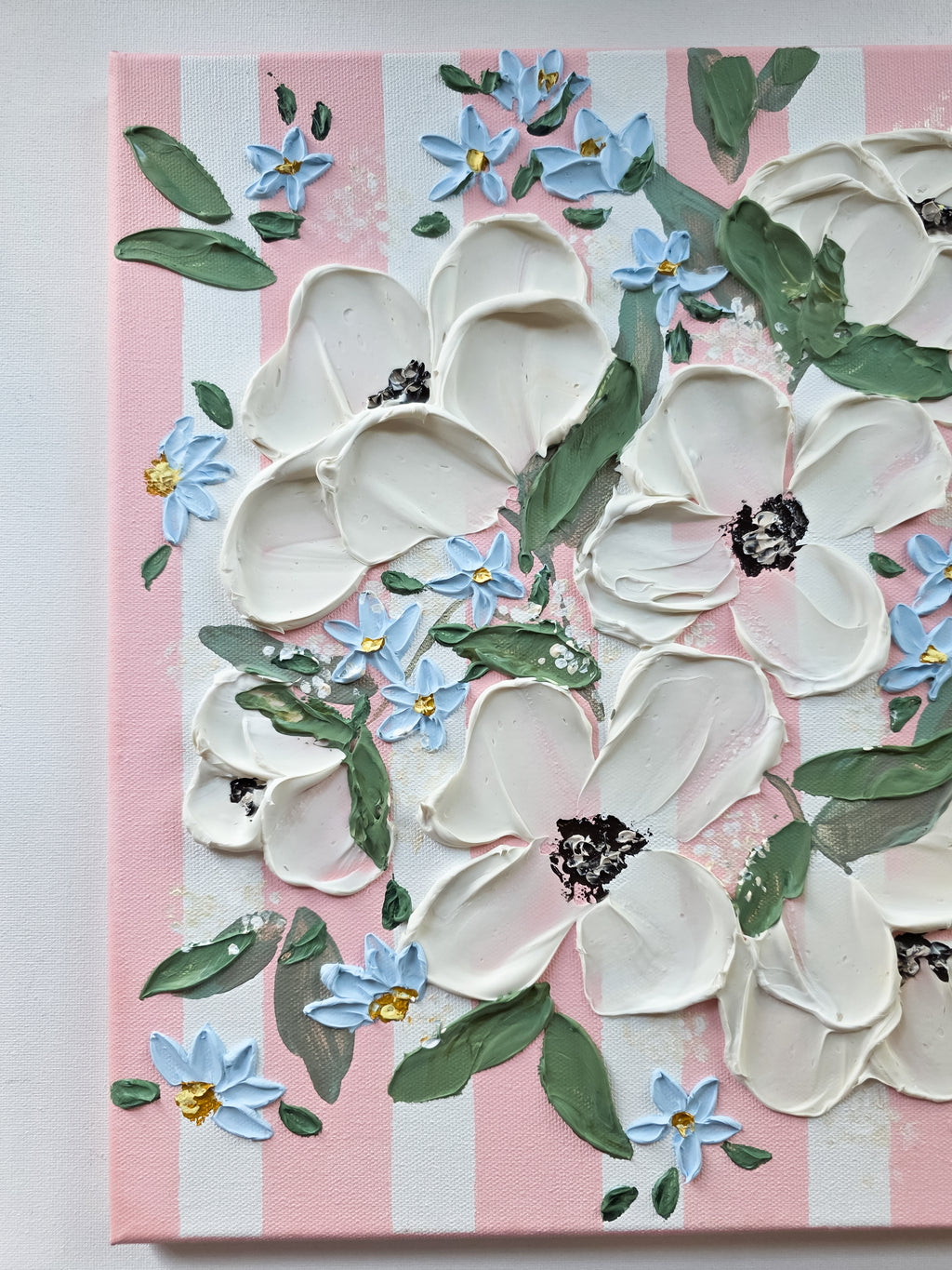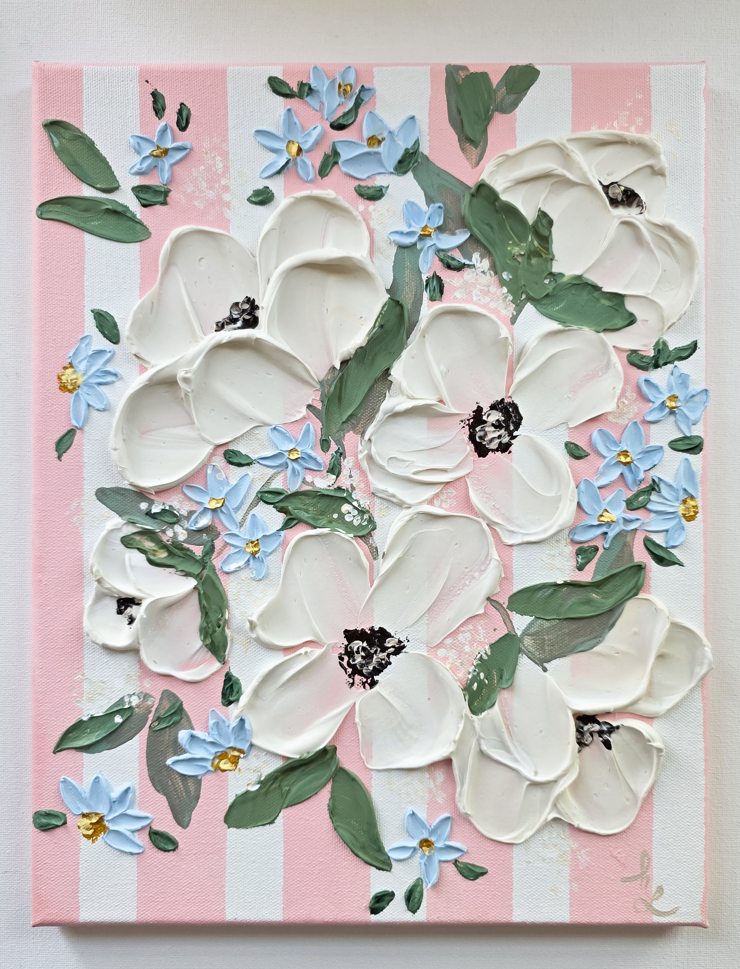 This sweet painting features soft pink stripes with beautiful, textured flowers.