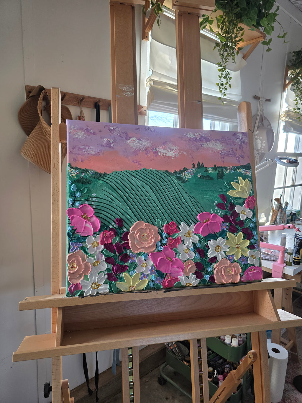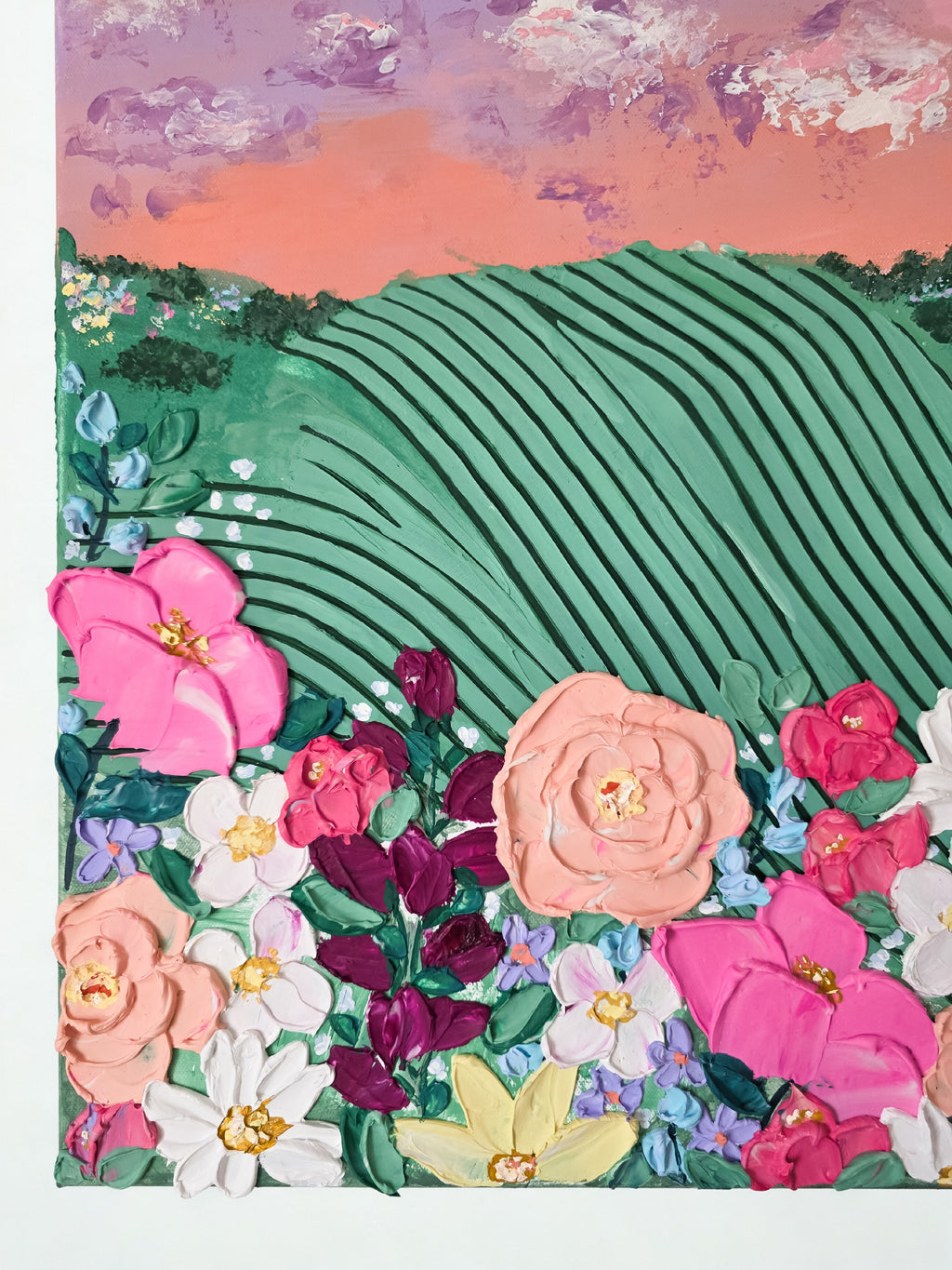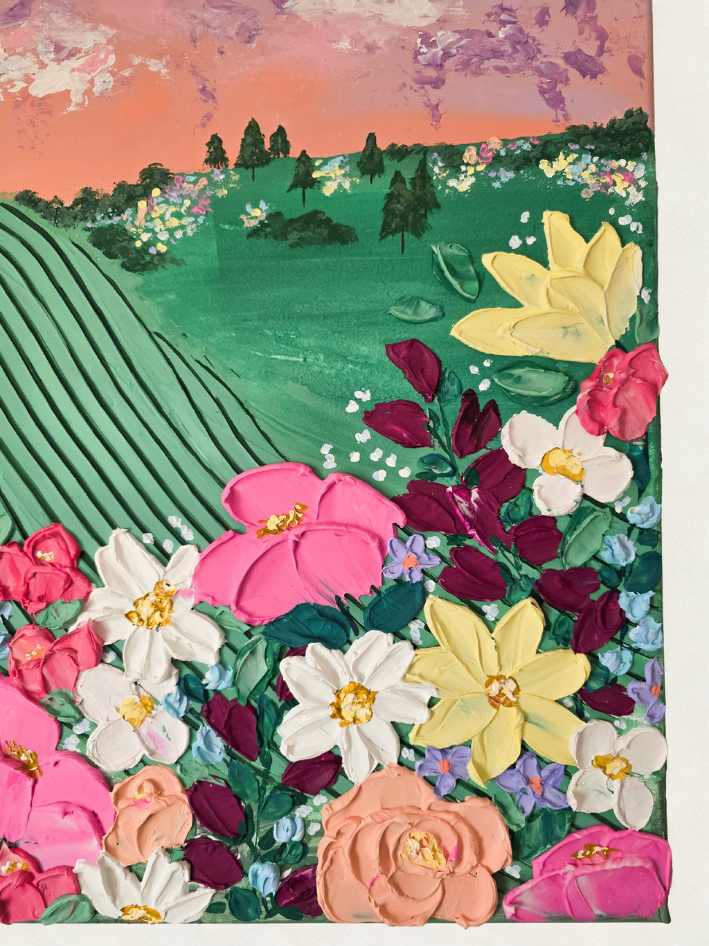 Step into a whimsical world with “Fields of Daydreams”, a textured floral landscape that captures the magic of golden hour. Layers of thick, sculpted blooms spill across the canvas in soft pinks, creamy yellows, and vibrant whites, leading your eyes toward rolling green hills beneath a pastel sunset sky. Every petal is hand-painted with rich texture, creating a piece that feels both romantic and full of life.