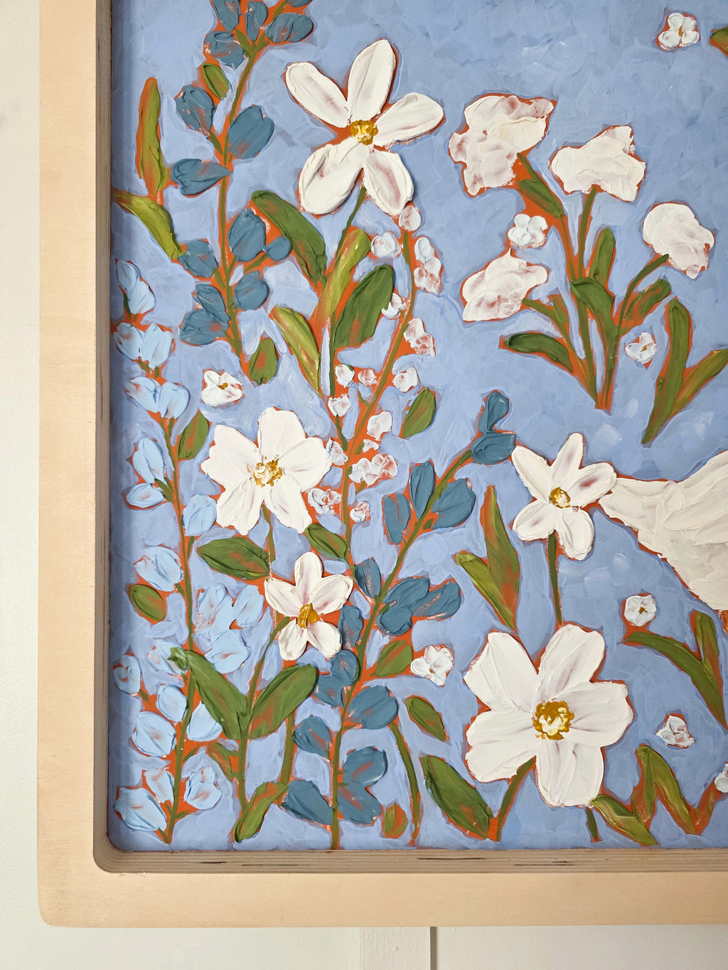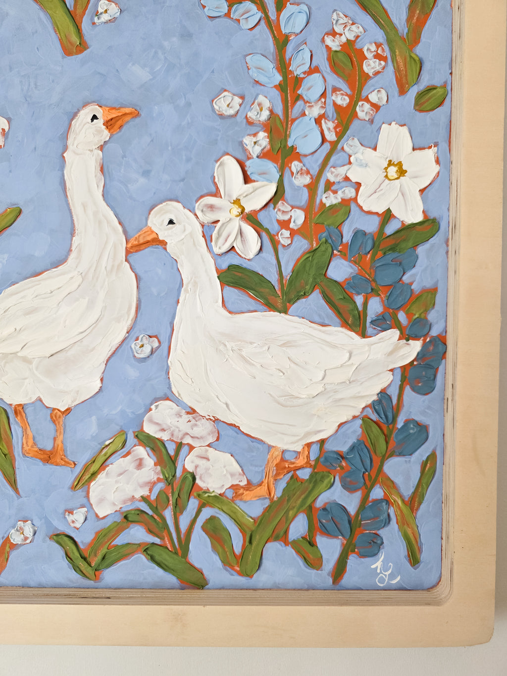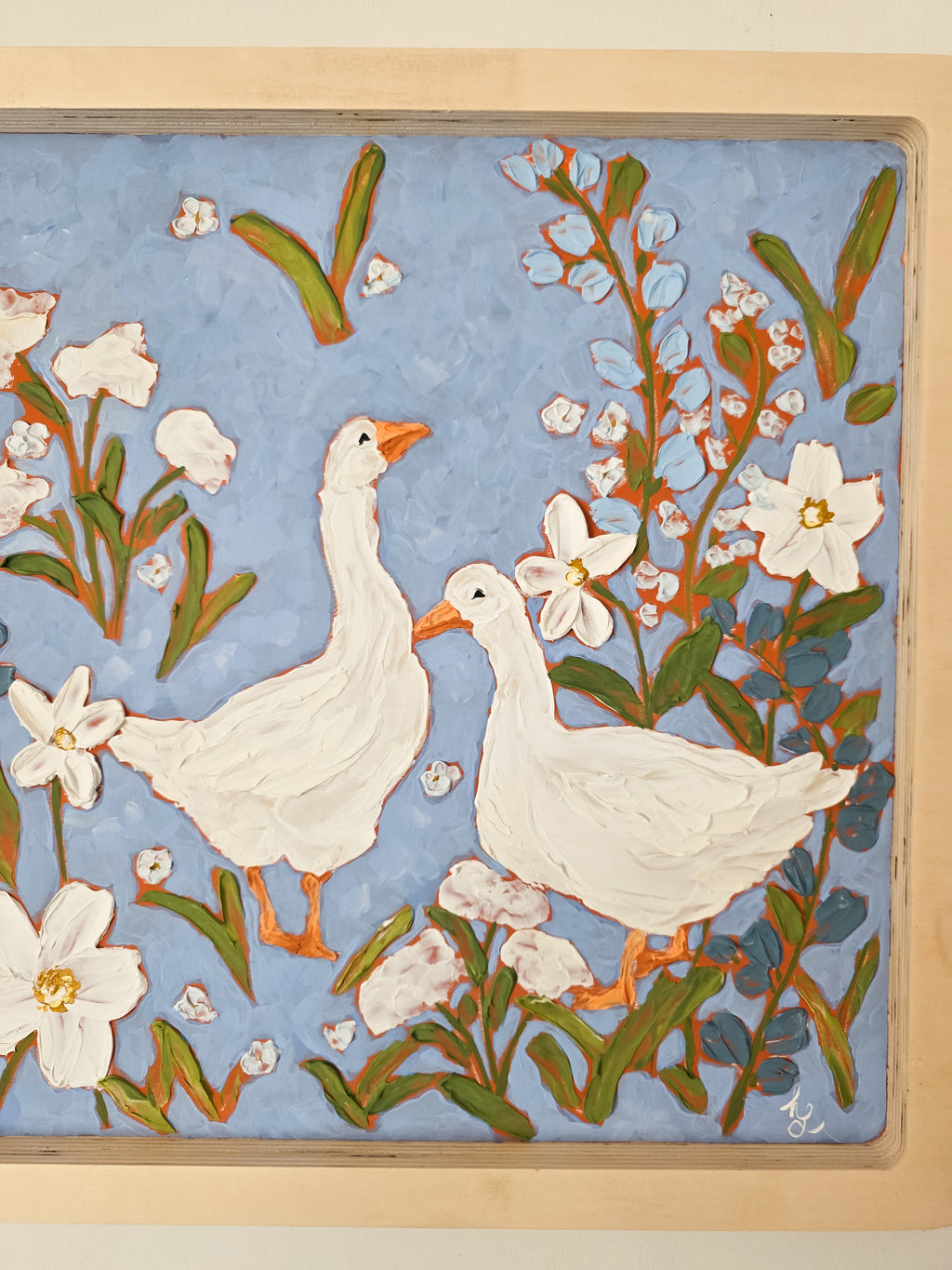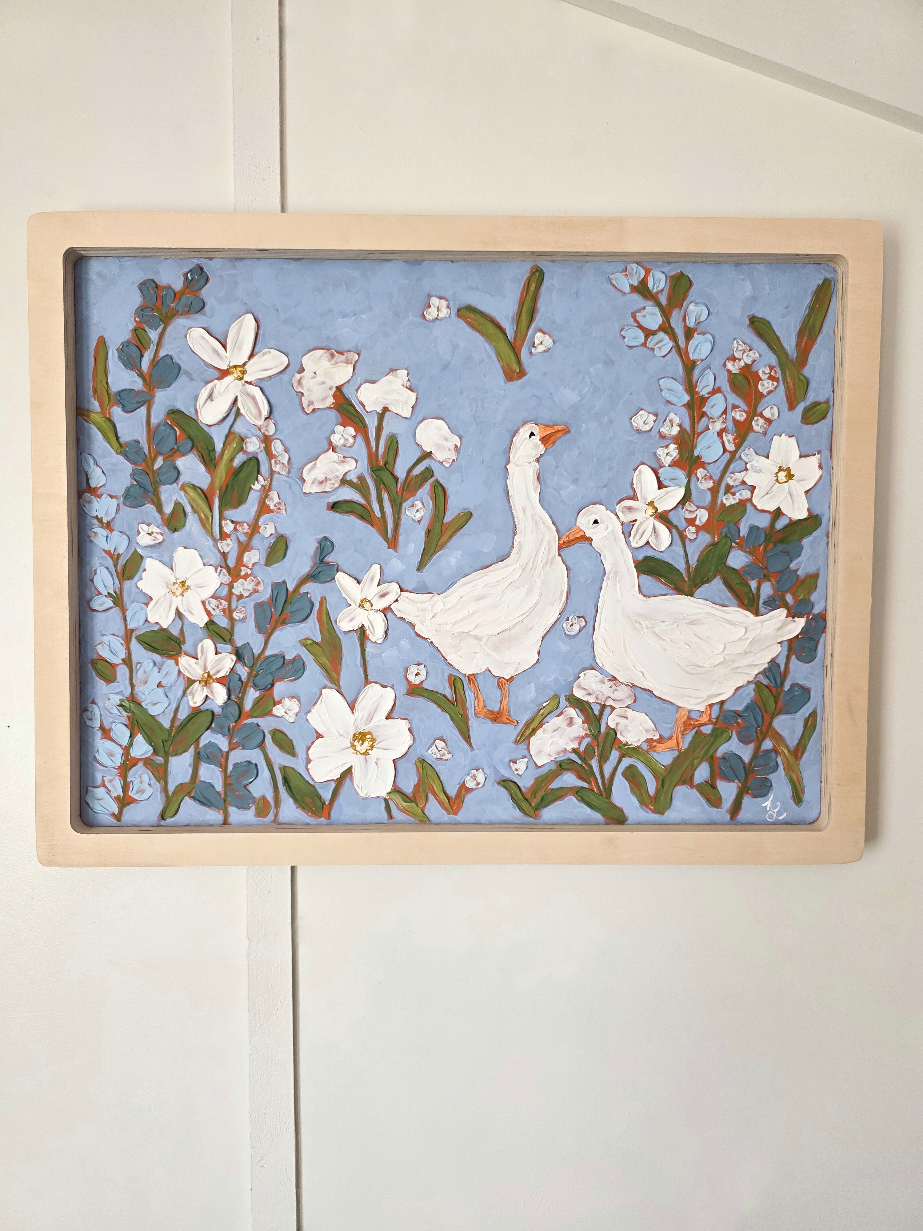 "Goose Meadow Morning” is a charming, textured floral painting featuring a pair of white geese surrounded by lush wildflowers. Set against a soft blue background, this artwork blends cottagecore warmth with modern folk-art style. Thick, sculptural brushstrokes add dimension and a handcrafted feel, while the natural wood frame enhances its organic, farmhouse aesthetic.