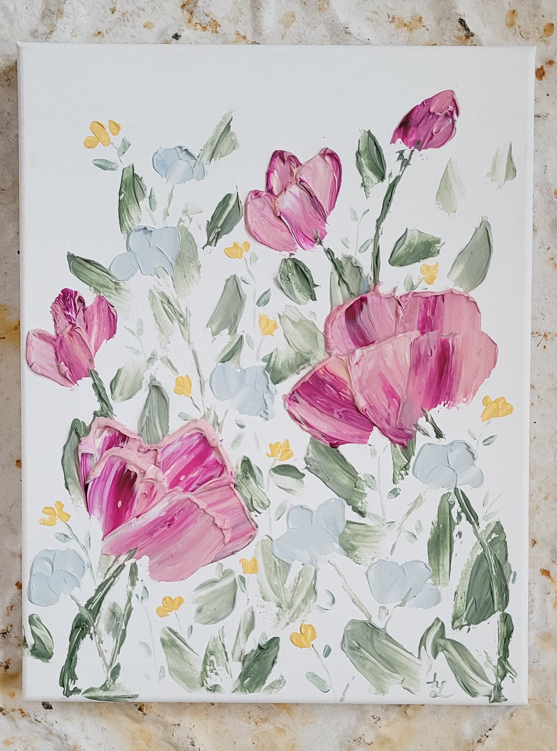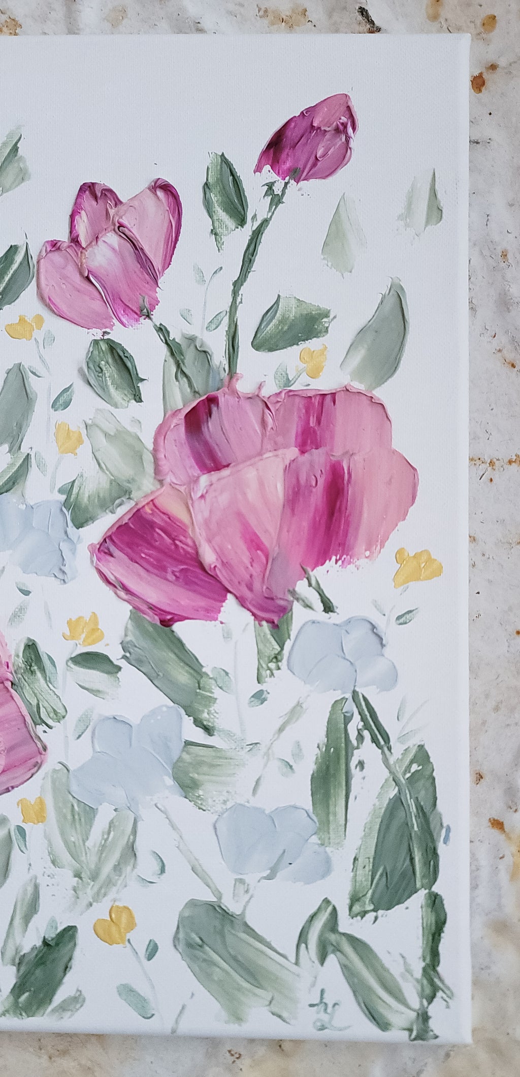 A beautiful wildflowers painting filled with texture, shades of pink, blue and yellow.