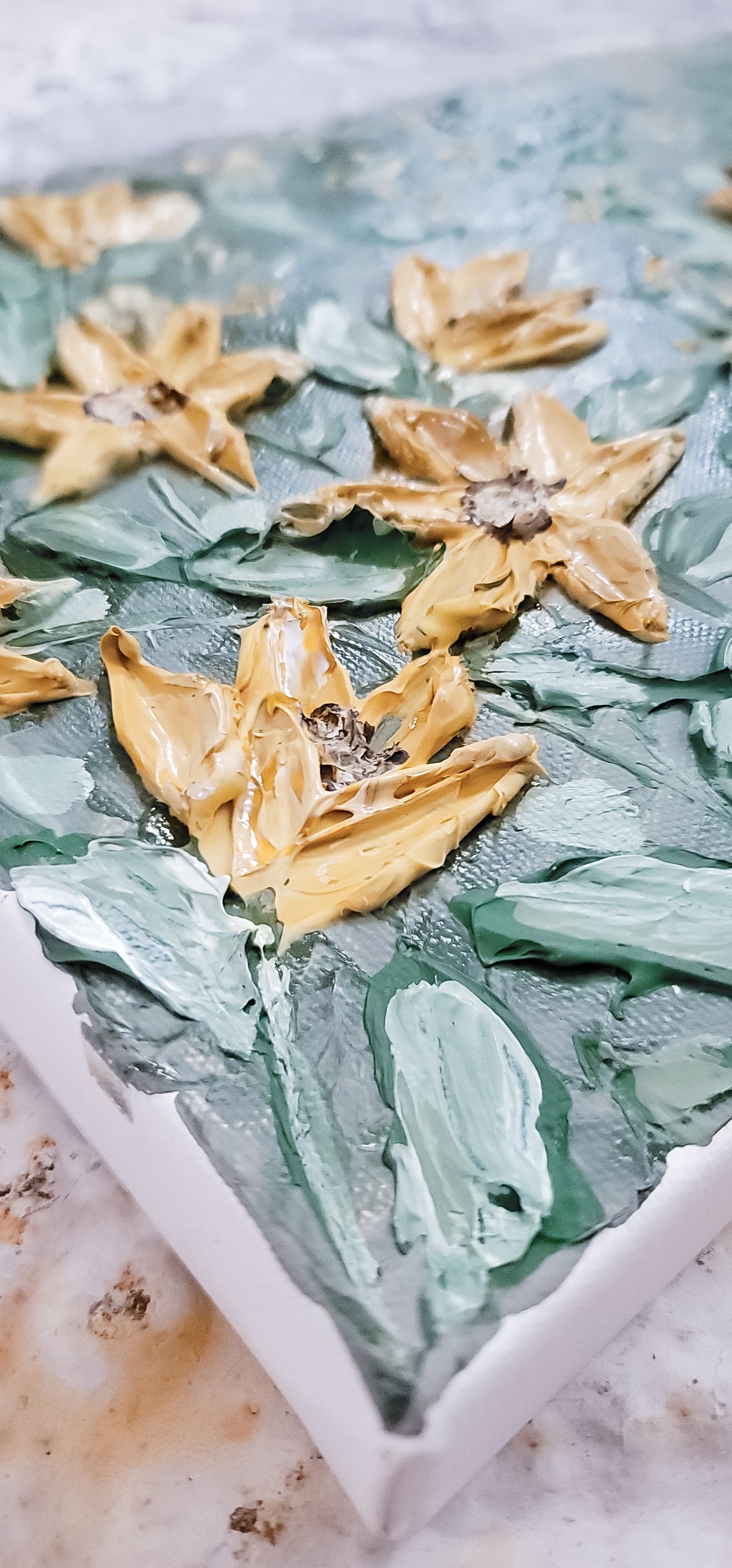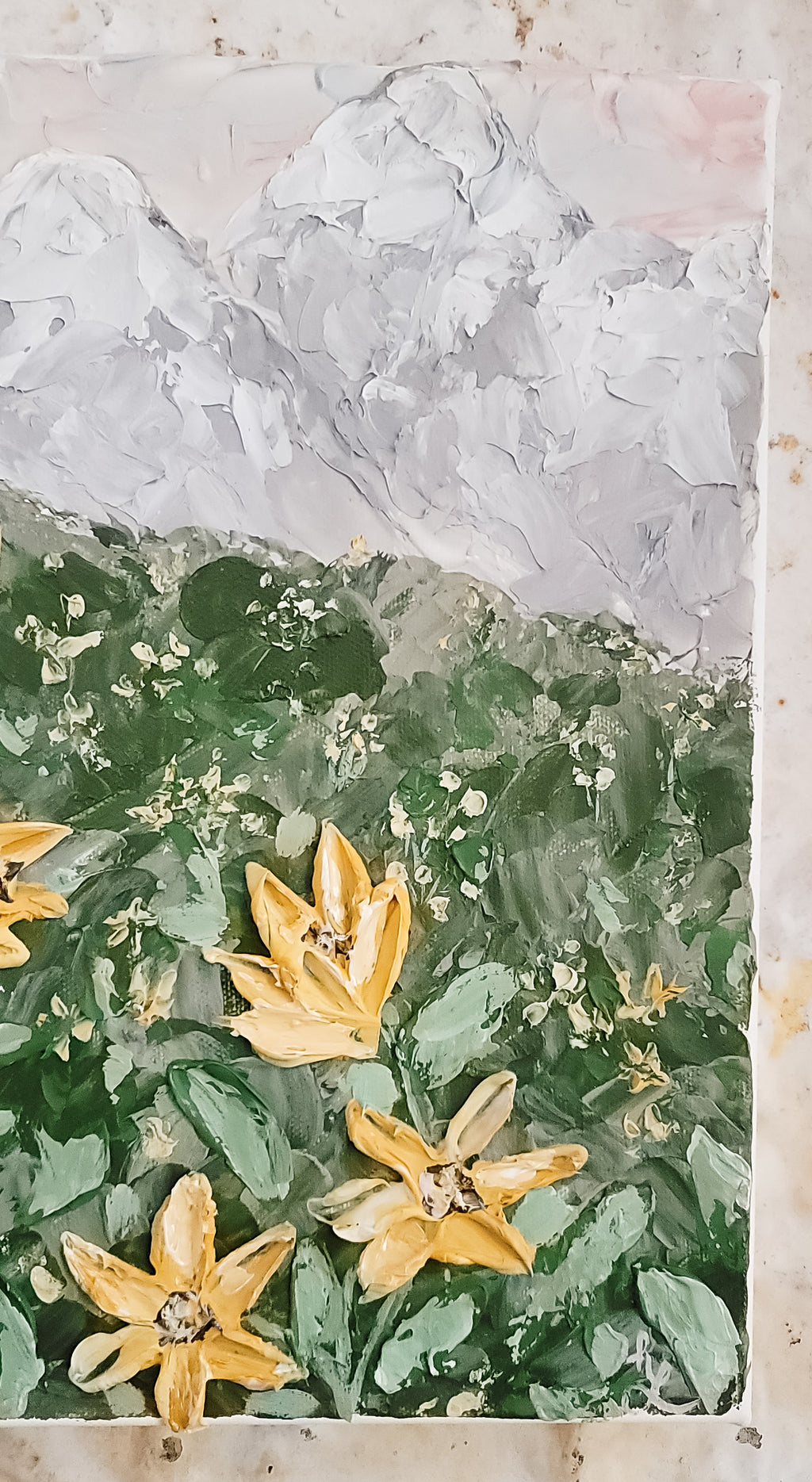 A beautiful scenic painting of the Colorado mountains, a sunset backdrop with wild sunflowers.