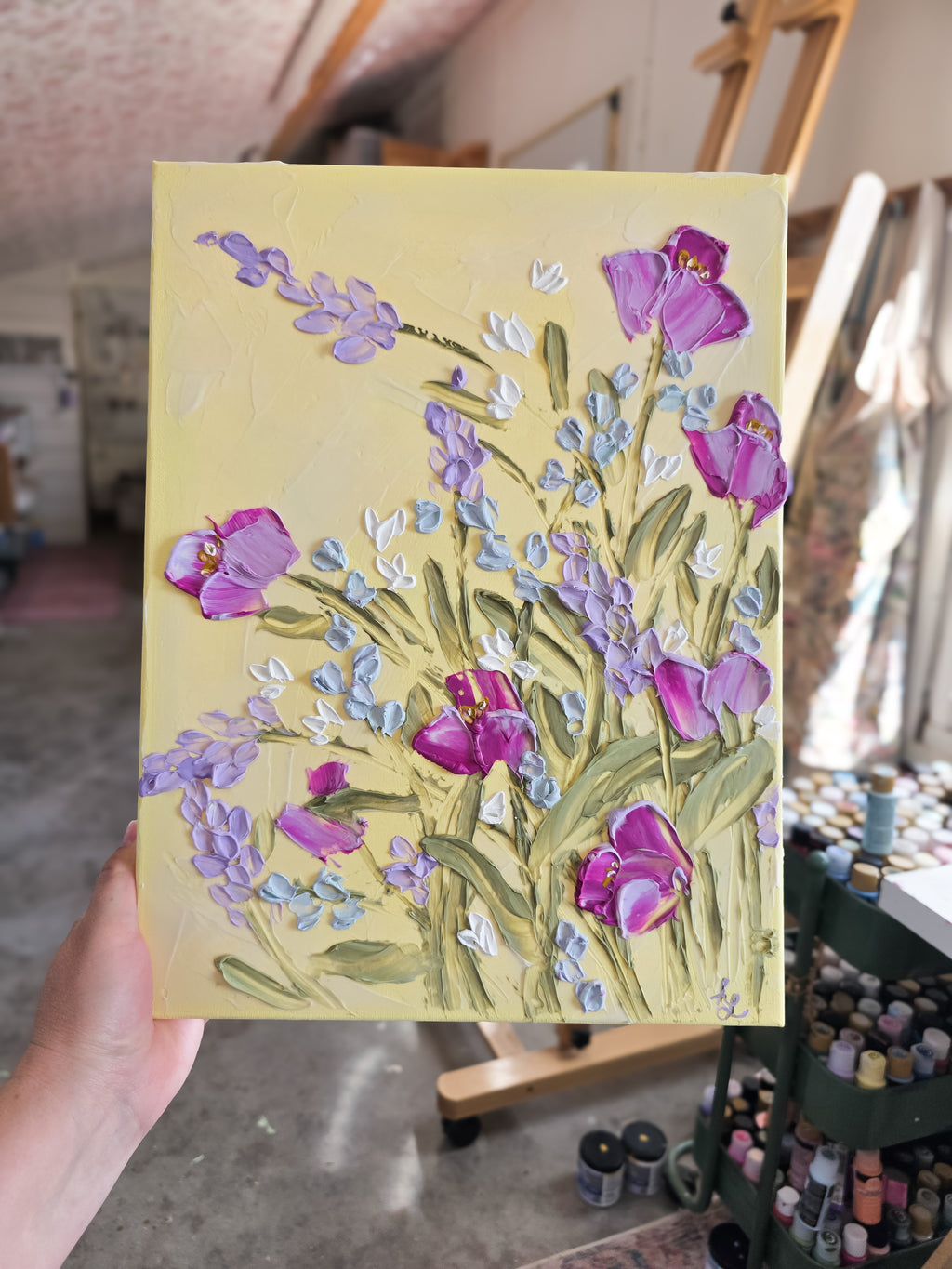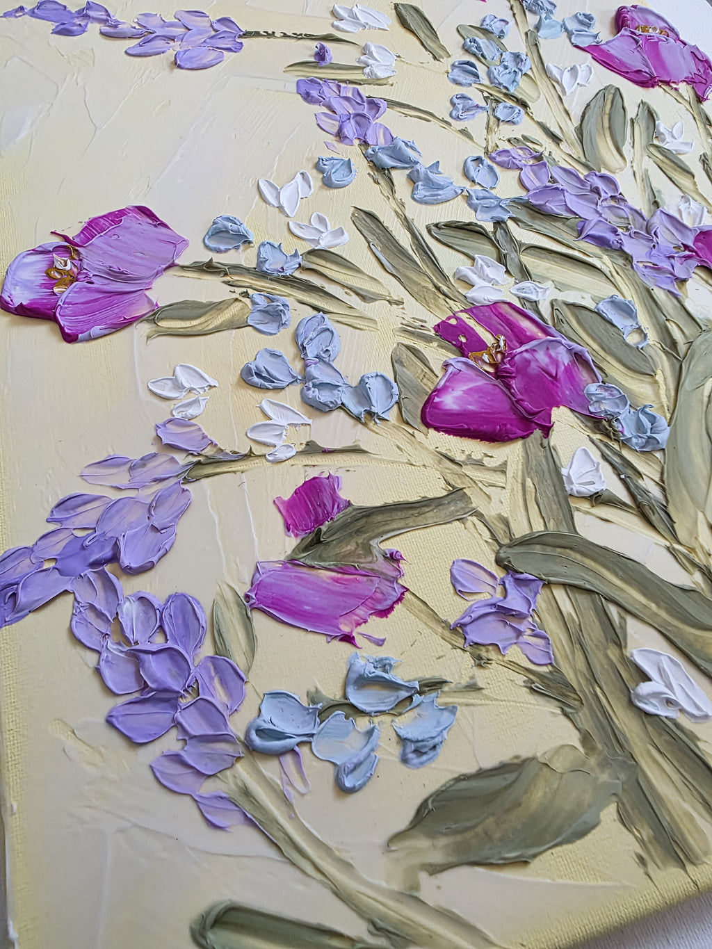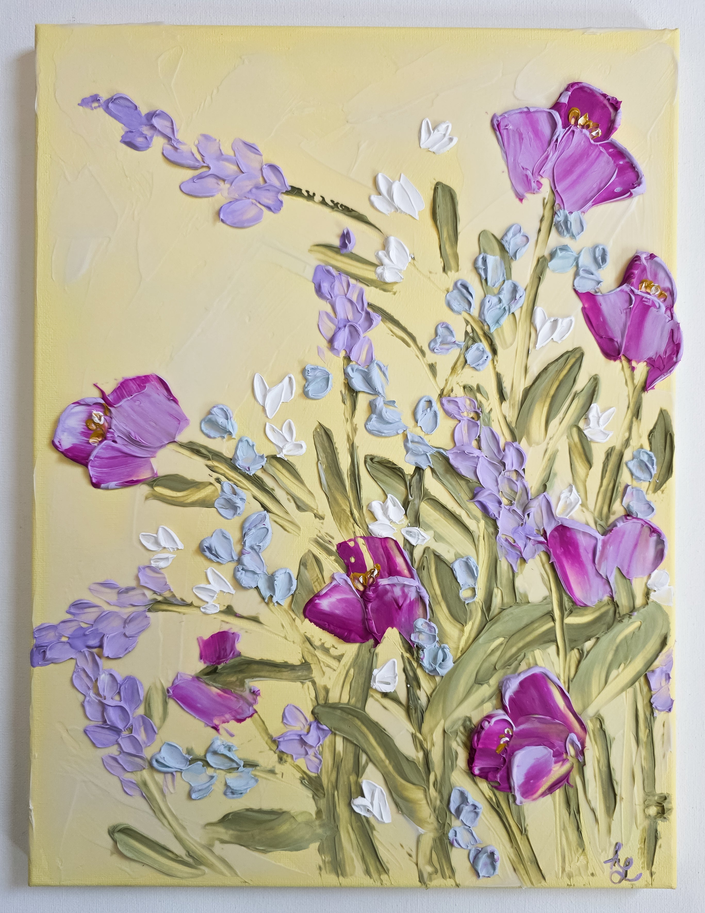 A soft, buttery yellow background with beautifully textured wildflowers. This painting will surely bring JOY to anyone who sees it!