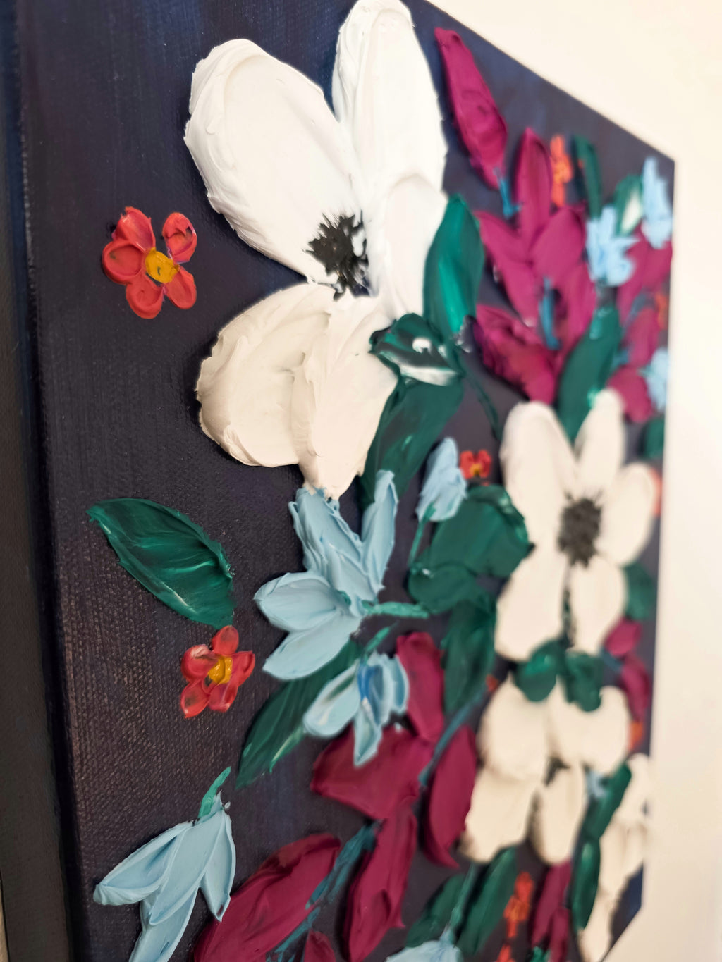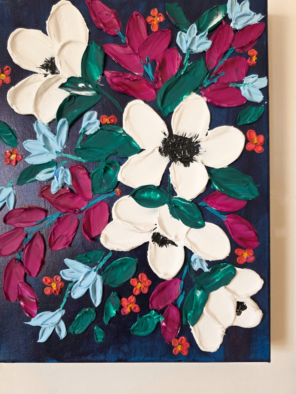 “Moonlit Flora” is an original textured floral painting created with rich layers of palette-knife strokes. Featuring creamy white blossoms, deep magenta petals, and soft blue accents set against a dark, moody background, this artwork brings a bold yet elegant touch to any space. The thick, sculptural texture adds depth and dimension, making it a perfect statement piece for living rooms, bedrooms, entryways, or gallery walls. Ideal for collectors who love modern botanical art, impasto painting, and vibrant floral decor.