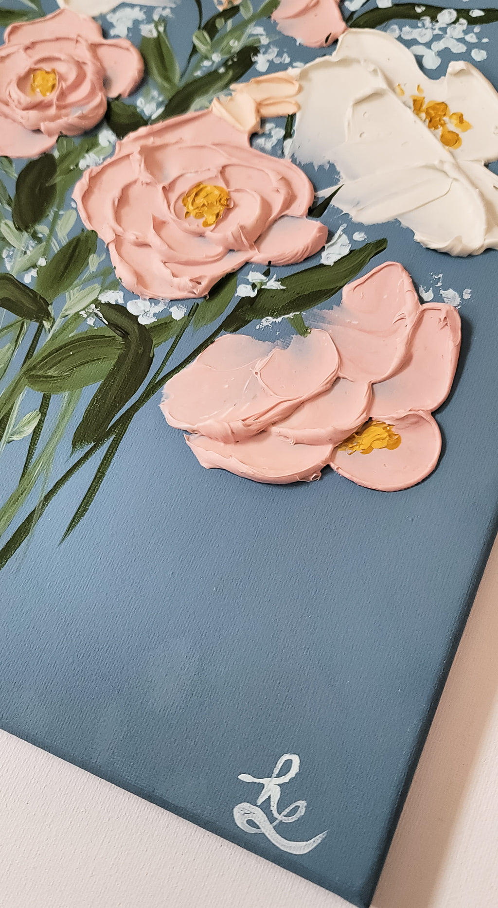 Soft colors with a moody blue background make this painting a classic beauty! Wildflowers and peonies full of texture.