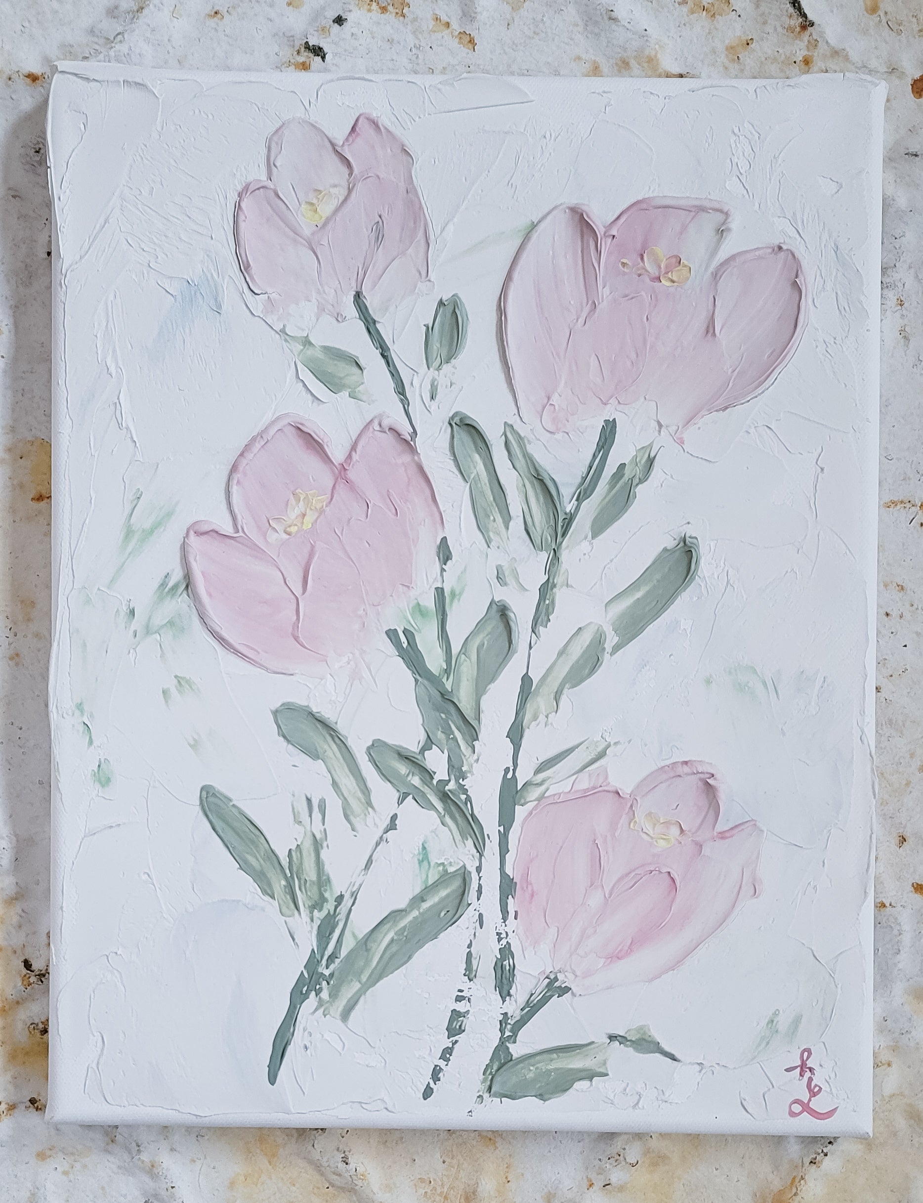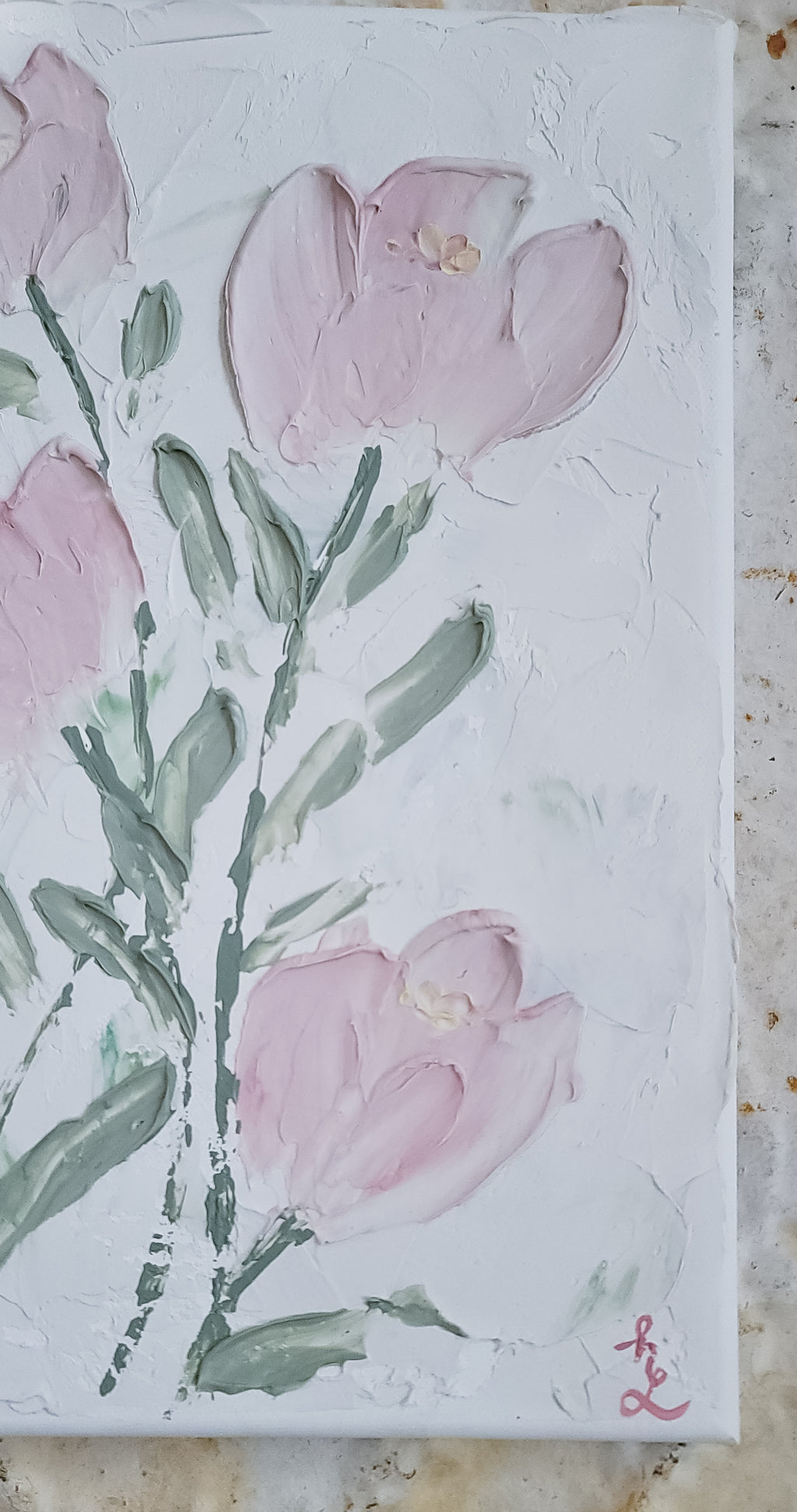 Soft pink flowers painted on canvas that is filled with beautiful texture.