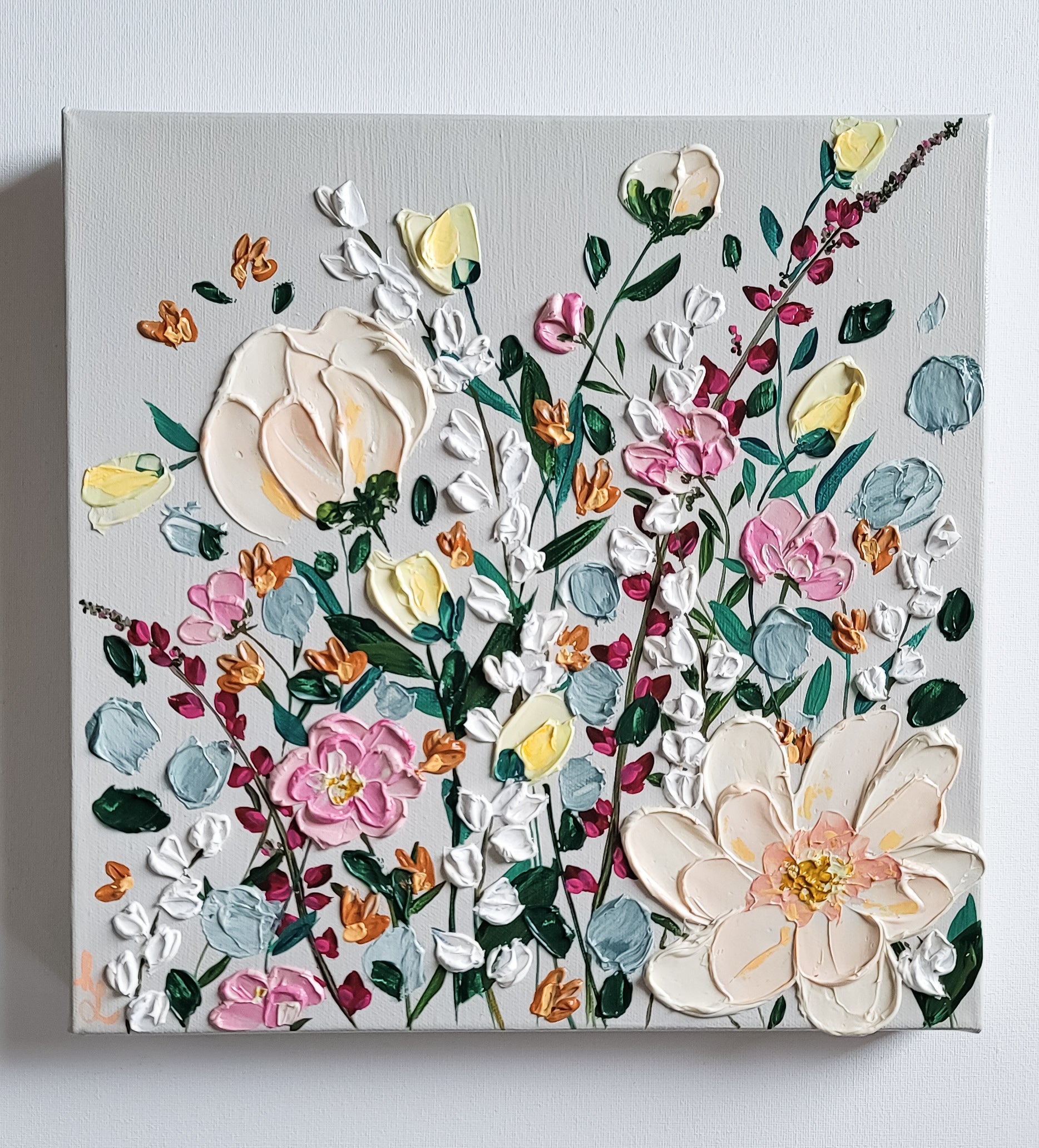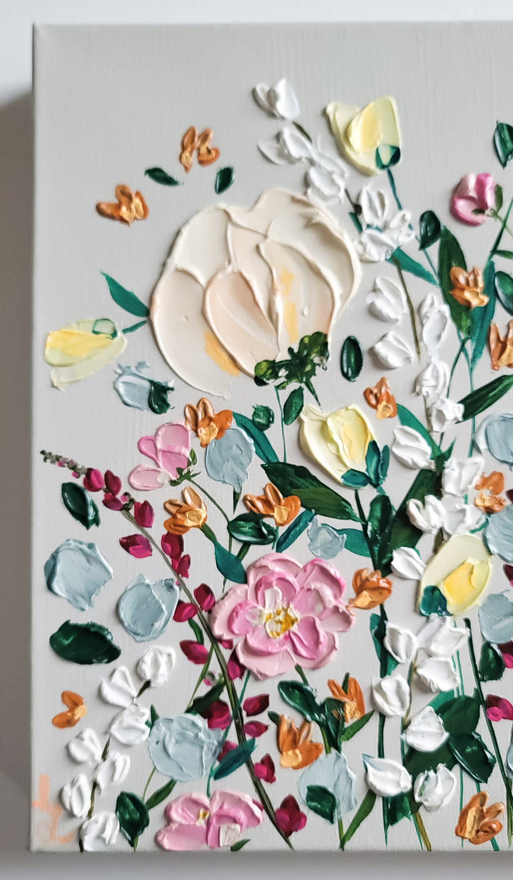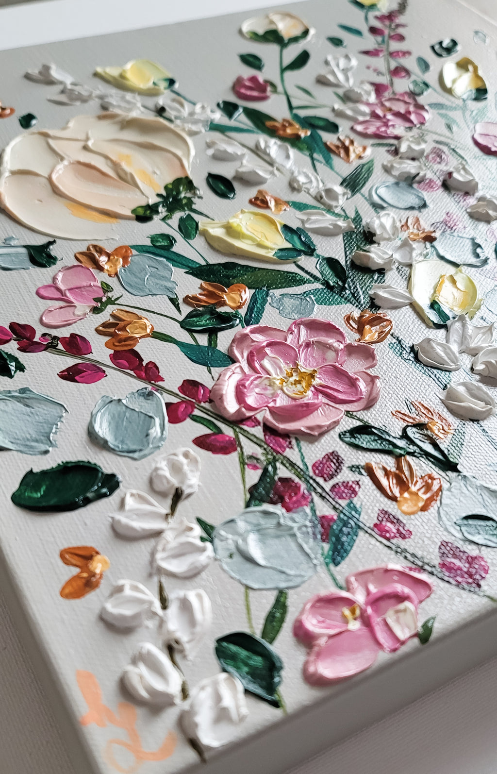 A beautiful meadowy painting filled with wild flowers. This is a happy and whimsical piece that has both texture and spring colors that is sure to bring joy into any space!