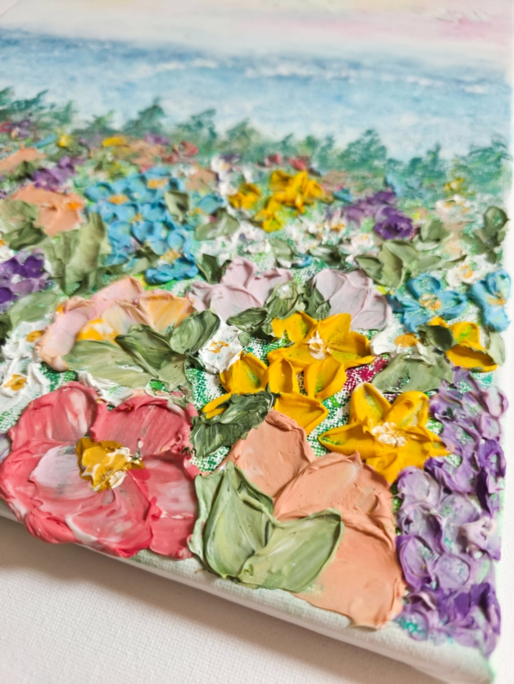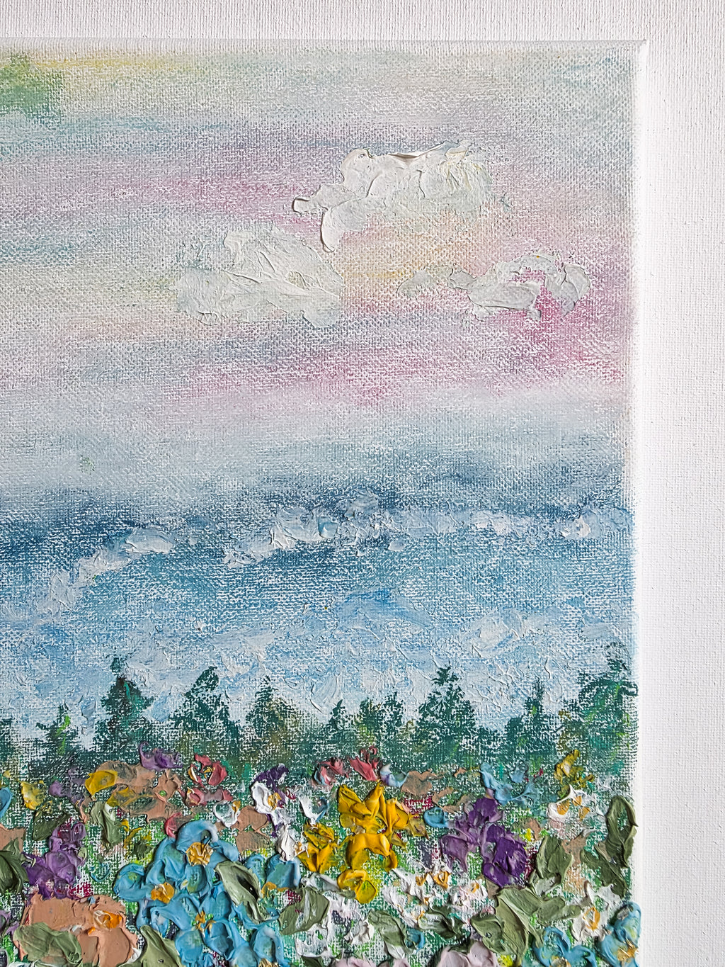 A mixed media style painting created with oil pastels and acrylic paint that features beautiful and vibrant wildflowers and a cotton candy colored sky that is lined with evergreens.
