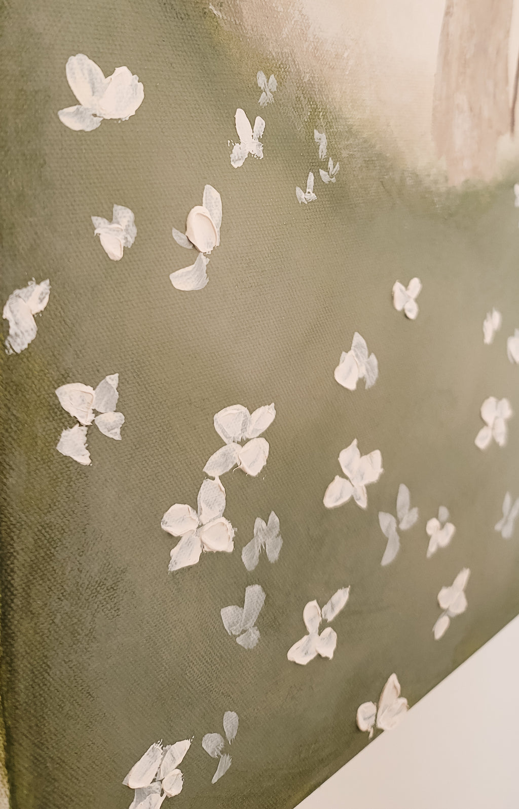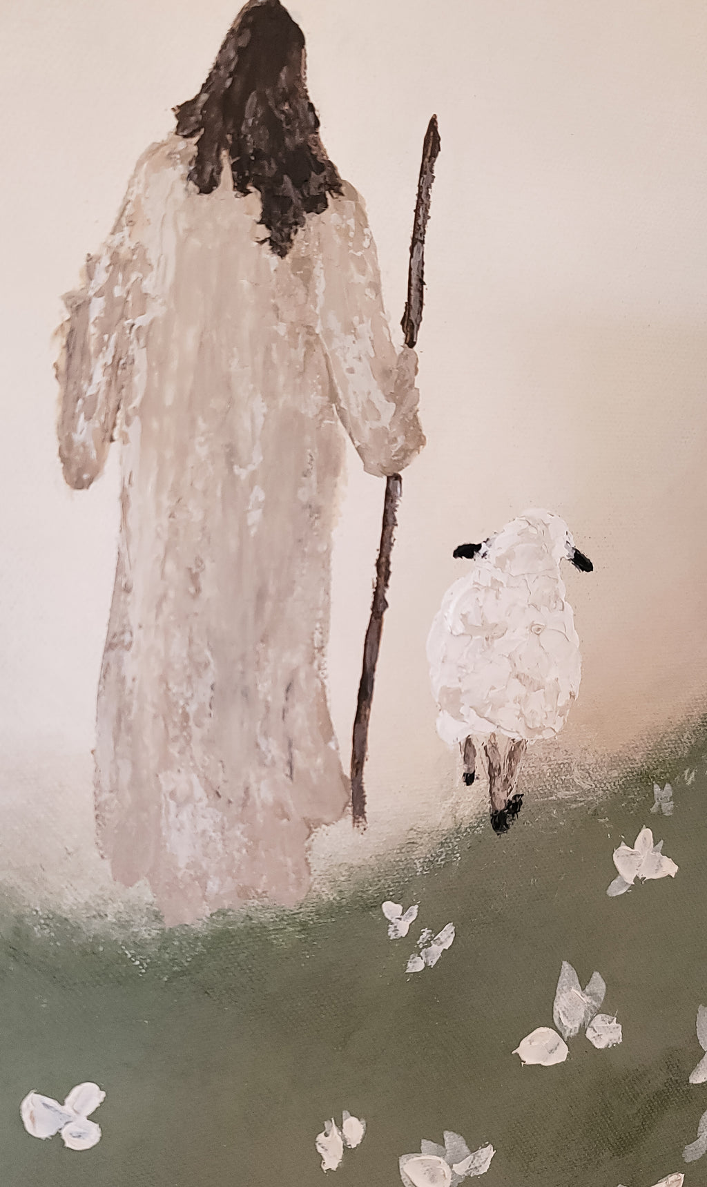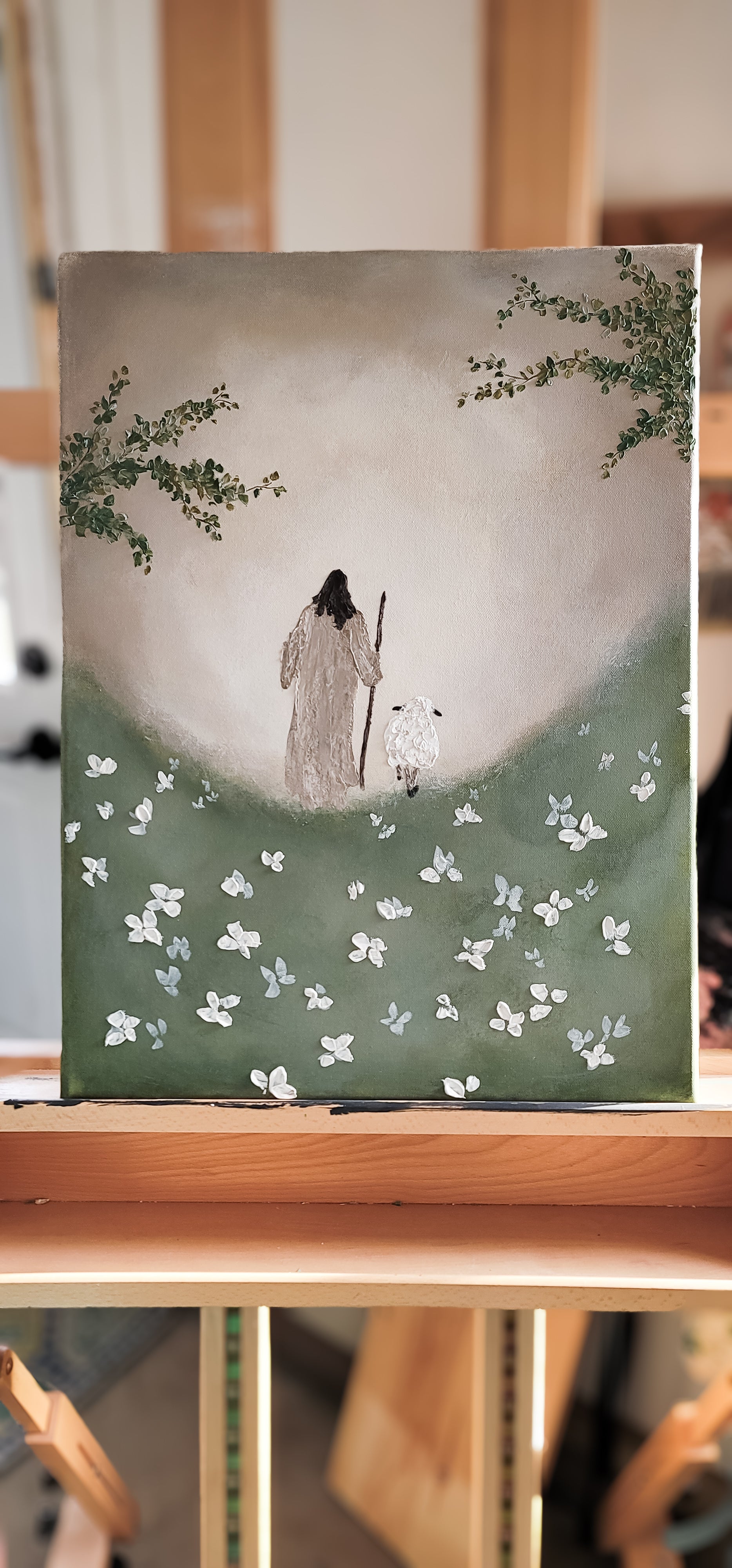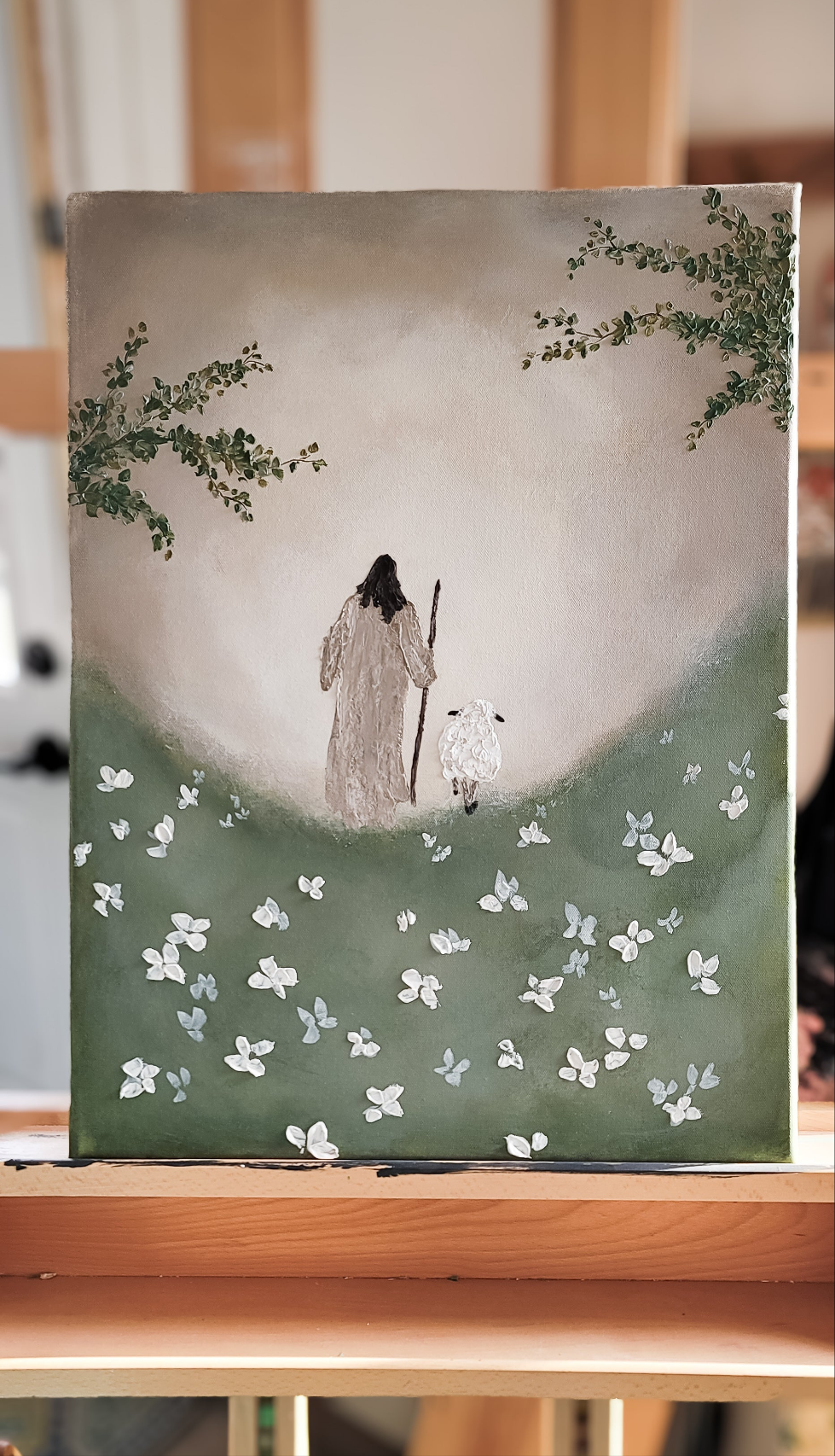 "The 99" Jesus leaves the 99 to go find the one. A beautiful neutral toned painting with texture and a wonderful reminder. You can never stray to far from Him. He will always come find you and meet you where you are.