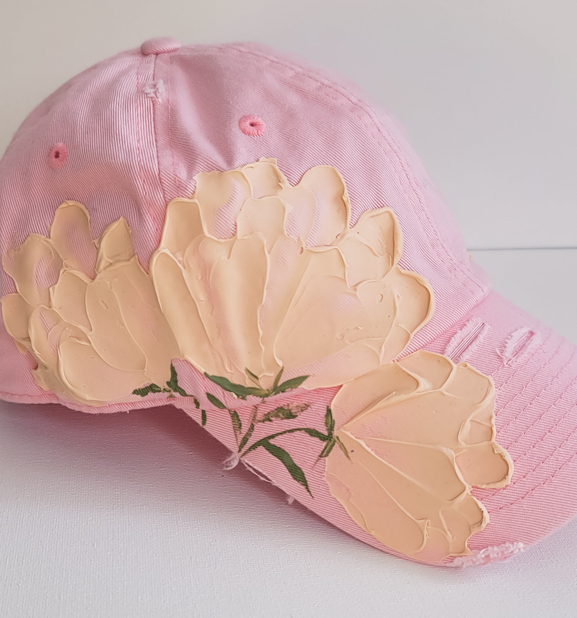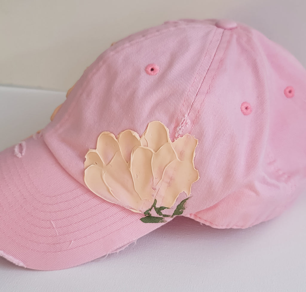 Womens Ball cap with painted peonies and adjustable back.