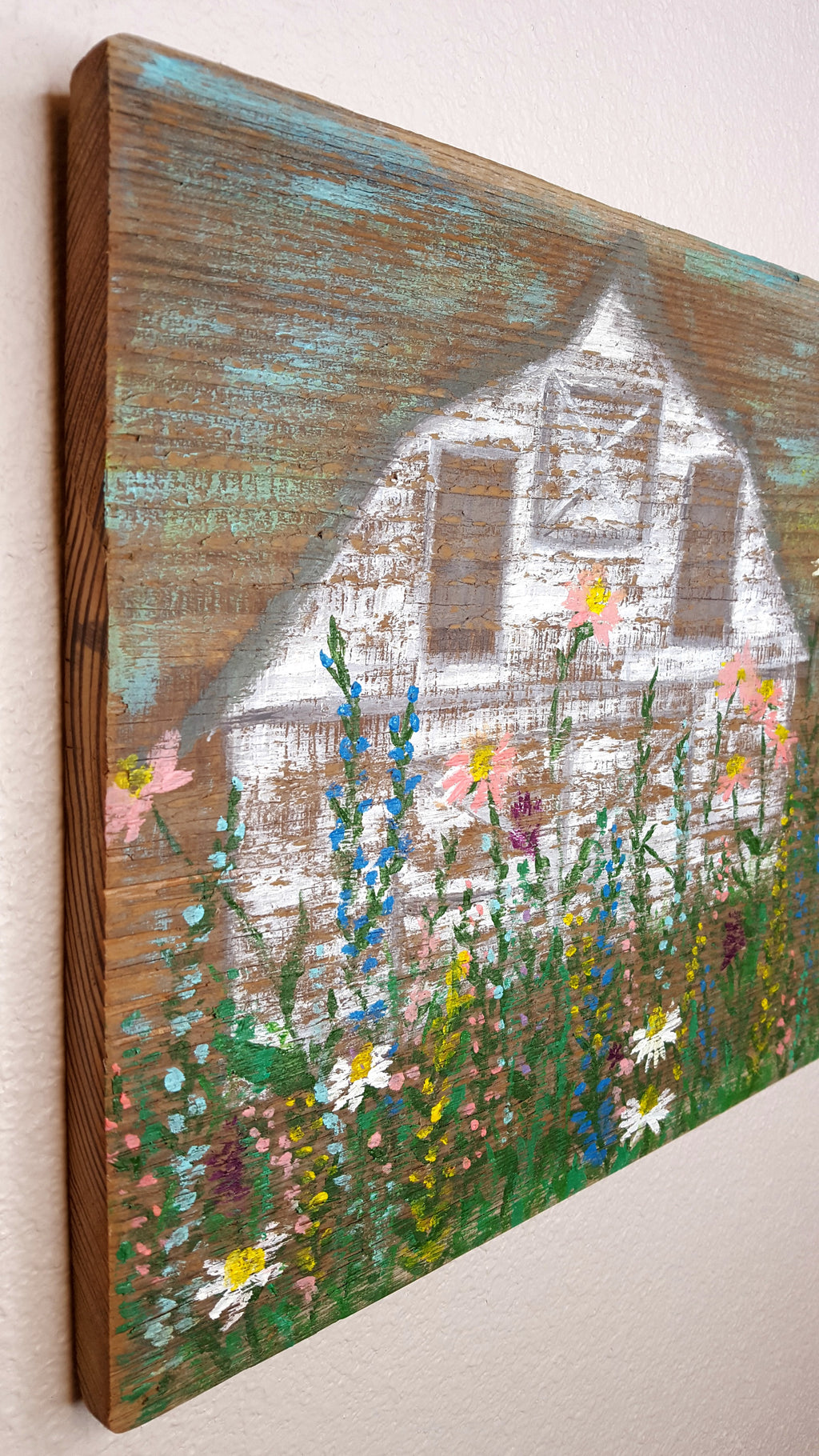 This is a hand-painted original done by Heather, the owner and creator of Wildflowers & Pistols. Painted using acrylics paints on a piece of Kansas barn wood. A weathered white barn surrounded by wildflowers titled "Grow Wild". Painting measures 18"L x 11.5"W and approximately 1" thick.
